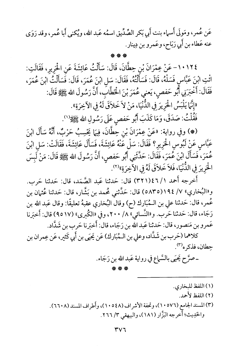١٠١٢٤ - عن عمران بن حطان، قال: سألت عائشة عن الحرير، فقالت: ائت ابن عباس فسله، قال: فسألته، فقال: سل ابن عمر، قال: فسألت ابن عمر، فقال: أخبرني أَبو حفص، يعني عمر بن الخطاب، أن رسول الله صَلى الله عَليه وسَلم قال: