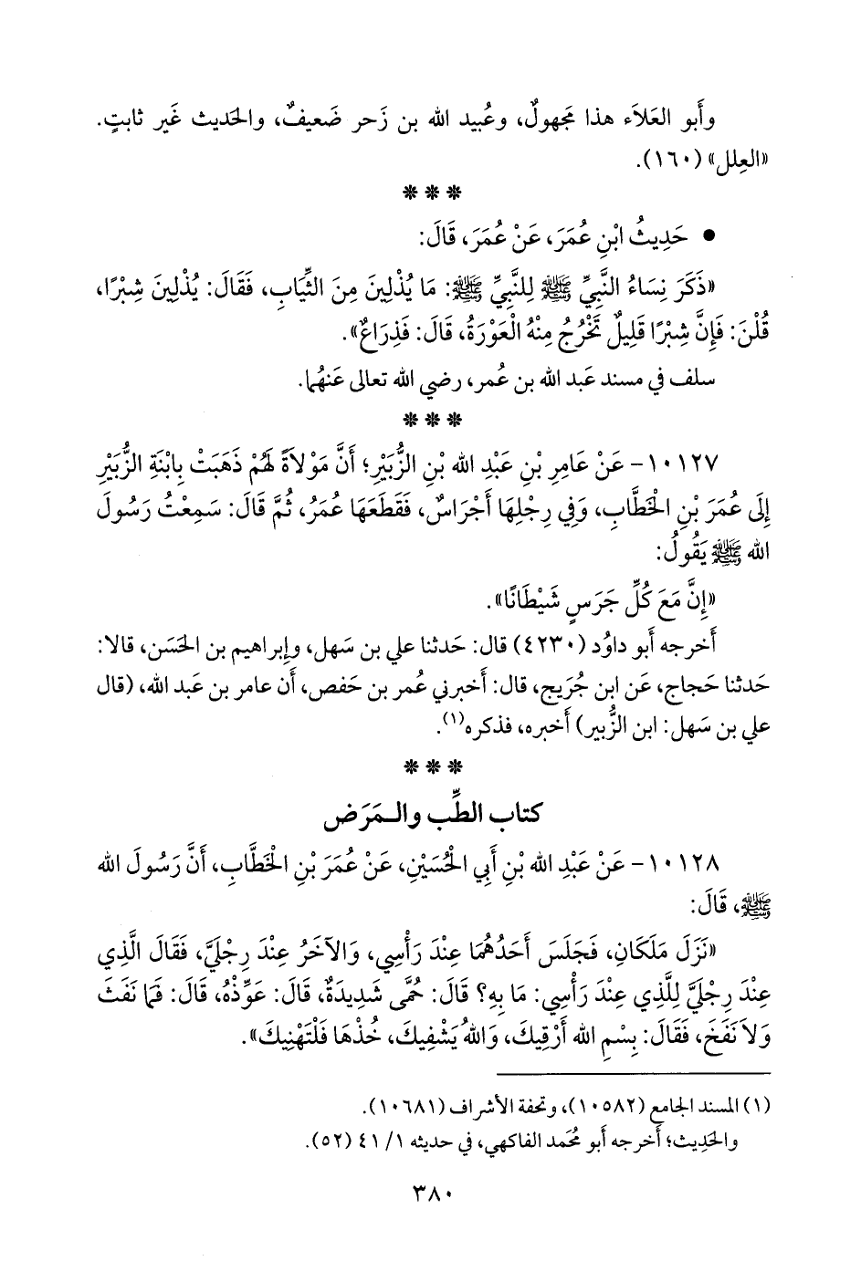 ١٠١٢٧ - عن عامر بن عبد الله بن الزبير؛ أن مولاة لهم ذهبت بابنة الزبير إلى عمر بن الخطاب، وفي رجلها أجراس، فقطعها عمر، ثم قال: سمعت رسول الله صَلى الله عَليه وسَلم يقول:
