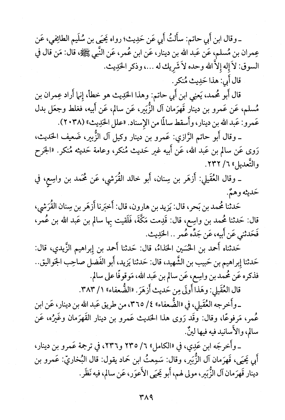 ـ وأخرجه العُقيلي في «الضعفاء» ٤/ ٣٦٥، من طريق عبد الله بن دينار، عن ابن عمر، مرفوعا، وقال: وقد روى هذا الحديث عَمرو بن دينار القَهرمان وغيره، عن سالم، والأسانيد فيه فيها لين.