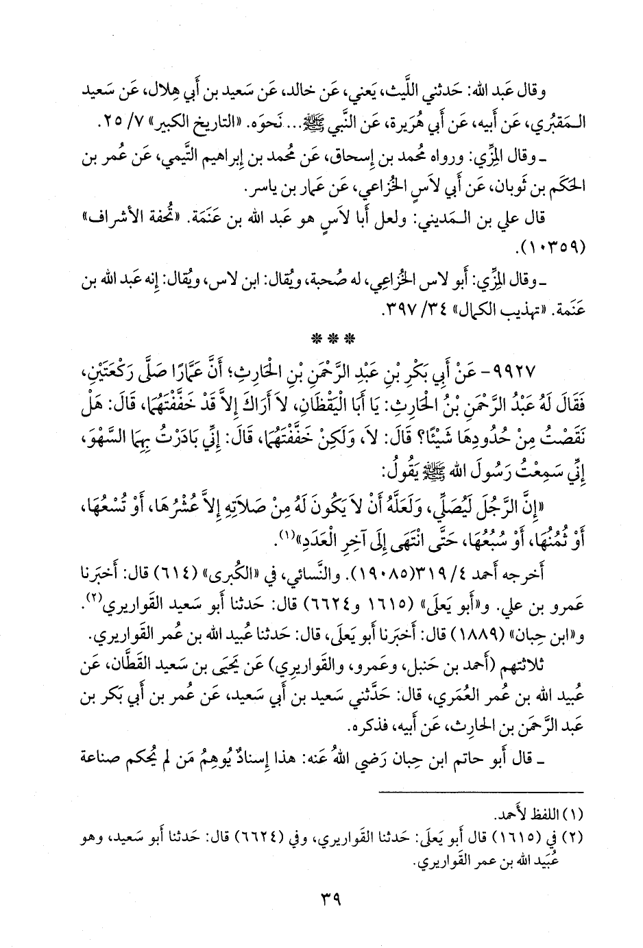 ٩٩٢٧ - عن أَبي بكر بن عبد الرَّحمَن بن الحارث؛ أن عمارًا صلى ركعتين، فقال له عبد الرَّحمَن بن الحارث: يا أبا اليقظان، لا أراك إلا قد خففتهما، قال: هل نقصت من حدودها شيئا؟ قال: لا، ولكن خففتهما، قال: إني بادرت بهما السهو، إني سمعت رسول الله صَلى الله عَليه وسَلم يقول: