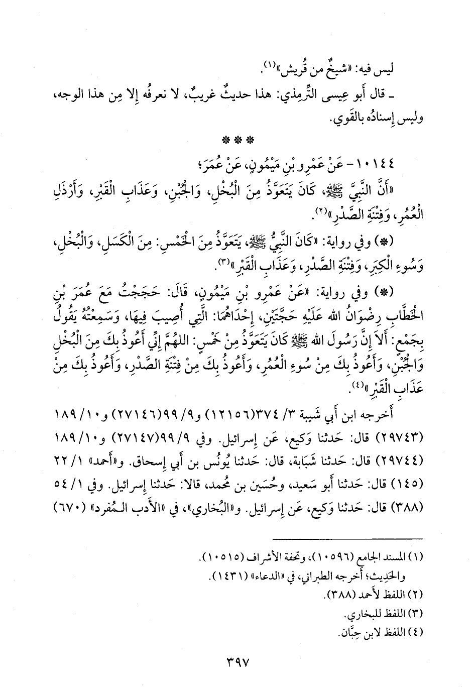 - وفي رواية: «عن عَمرو بن ميمون، قال: حججت مع عمر بن الخطاب رضوان الله عليه حجتين، إحداهما: التي أصيب فيها، وسمعته يقول بجمع: ألا إن رسول الله صَلى الله عَليه وسَلم كان يتعوذ من خمس: اللهم إني أعوذ بك من البخل والجبن، وأعوذ بك من سوء العمر، وأعوذ بك من فتنة الصدر، وأعوذ بك من عذاب القبر» (¬٣).