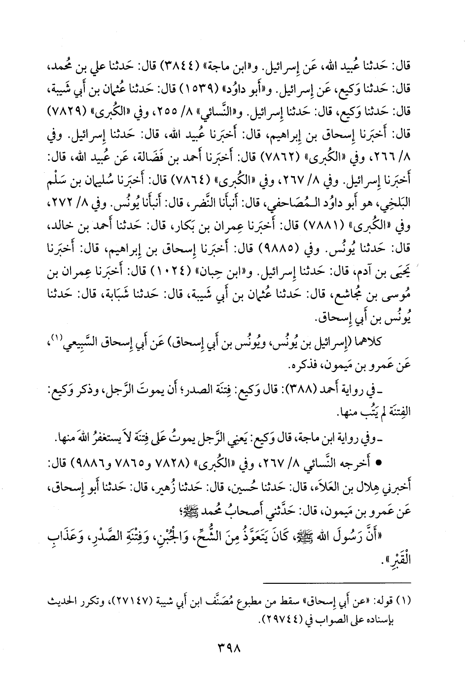 • وأخرجه النَّسَائي ٨/ ٢٦٧، وفي «الكبرى» (٧٨٦٦ و ٩٨٨٧) قال: أخبرنا أحمد بن سليمان، قال: حدثنا أَبو داود، عن سفيان، عن أبي إسحاق، عن عَمرو بن ميمون، قال: