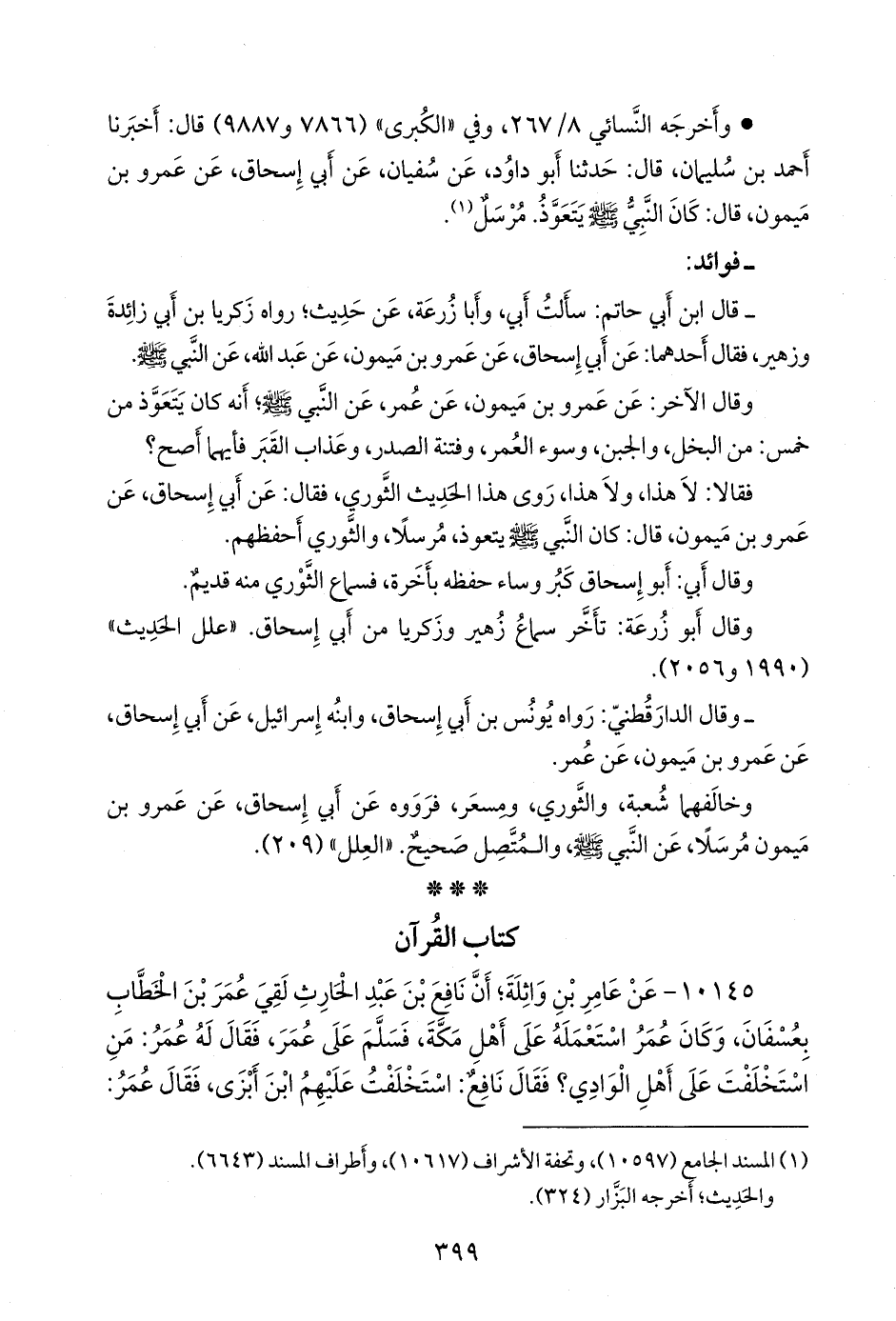 فقالا: لا هذا، ولا هذا، روى هذا الحديث الثوري، فقال: عن أبي إسحاق، عن عَمرو بن ميمون، قال: كان النبي صَلى الله عَليه وسَلم يتعوذ، مرسلا، والثوري أحفظهم.