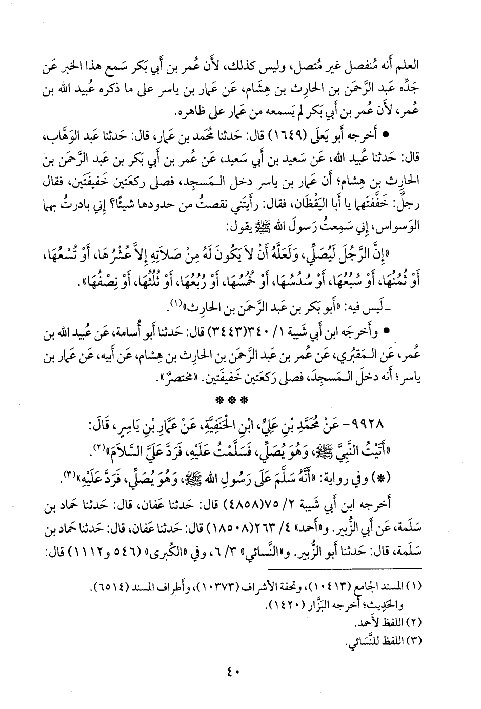 كلاهما (عبد الوَهَّاب الثقفي، ويحيى بن سعيد القطان) عن عُبيد الله بن عمر العُمَري، عن سعيد بن أَبي سعيد المَقبُري، عن عمر بن أَبي بكر بن عبد الرحمن بن الحارث بن هشام؛ أَن عمار بن ياسر دخل المسجد، فصلى ركعتين خفيفتين، فقال رجل: خففتهما يا أَبا اليقظان، فقال: رأَيتني نقصت من حدودها شيئًا؟ إِني بادرت بهما الوسواس، إِني سمعت رسول الله صَلى الله عَليه وسَلم يقول: