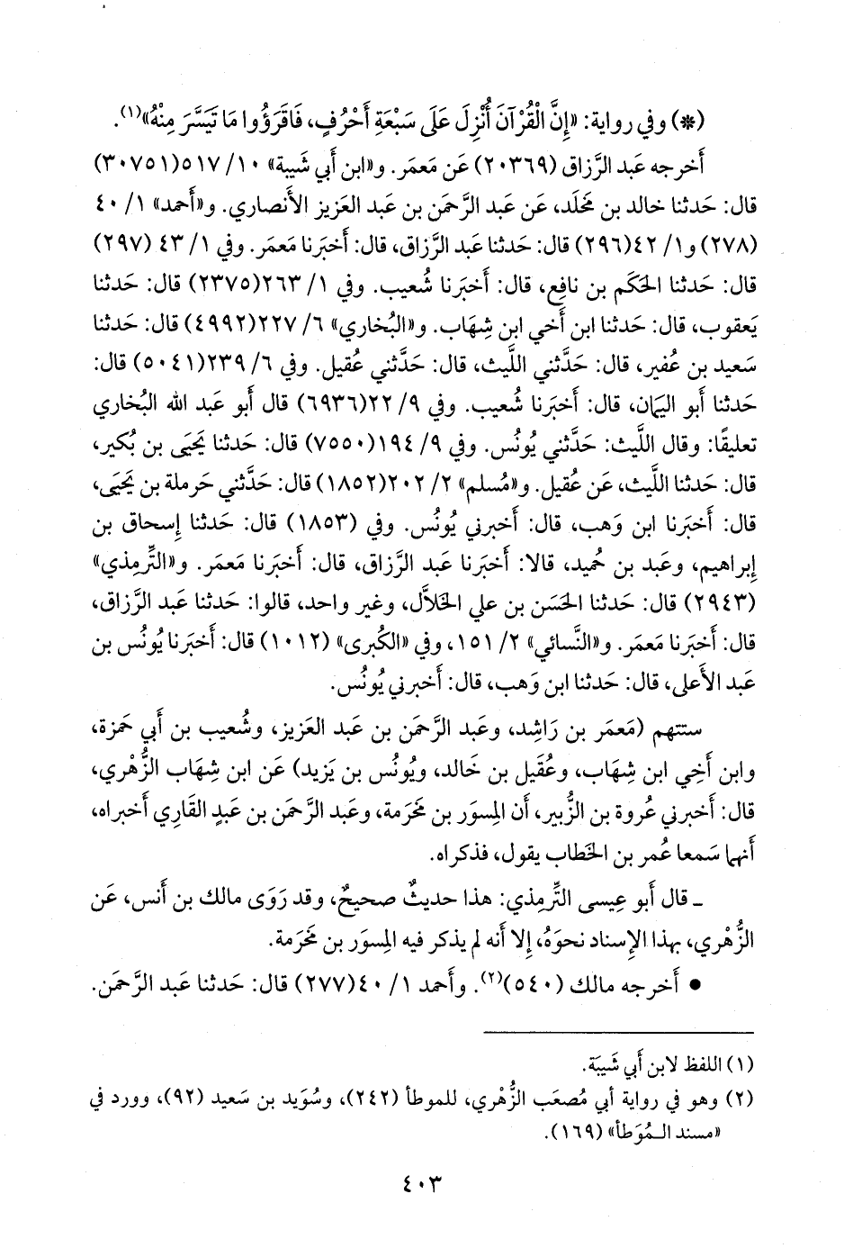 وفي (٢٣٧٥) قال: حدثنا يعقوب، قال: حدثنا ابن أخي ابن شهاب. و «البخاري» (٤٩٩٢) قال: حدثنا سعيد بن عفير، قال: حدثني الليث، قال: حدثني عُقَيل. وفي (٥٠٤١) قال: حدثنا أَبو اليمان، قال: أخبرنا شعيب. وفي (٦٩٣٦) قال أَبو عبد الله البخاري تعليقا: وقال الليث: حدثني يونس. وفي (٧٥٥٠) قال: حدثنا يحيى بن بُكير، قال: حدثنا الليث، عن عُقيل. و «مسلم» ٢/ ٢٠٢ (١٨٥٢) قال: حدثني حَرملة بن يحيى، قال: أخبرنا ابن وهب، قال: أخبرني يونس. وفي (١٨٥٣) قال: حدثنا إسحاق بن إبراهيم، وعَبد بن حُميد، قالا: أخبرنا عبد الرزاق، قال: أخبرنا مَعمَر. و «التِّرمِذي» (٢٩٤٣) قال: حدثنا الحسن بن علي الخَلَّال، وغير واحد، قالوا: حدثنا عبد الرزاق، قال: أخبرنا مَعمَر. و «النَّسَائي» ٢/ ١٥١، وفي «الكبرى» (١٠١٢) قال: أخبرنا يونس بن عبد الأعلى، قال: حدثنا ابن وهب، قال: أخبرني يونس.