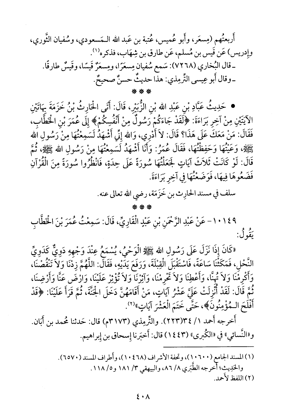 • حديث عباد بن عبد الله بن الزبير، قال: أتى الحارث بن خزمة بهاتين الآيتين من آخر براءة: {لقد جاءكم رسول من أنفسكم} إلى عمر بن الخطاب، فقال: من معك على هذا؟ قال: لا أدري، والله إني أشهد لسمعتها من رسول الله صَلى الله عَليه وسَلم وعيتها وحفظتها، فقال عمر: وأنا أشهد لسمعتها من رسول الله صَلى الله عَليه وسَلم ثم قال: لو كانت ثلاث آيات لجعلتها سورة على حدة، فانظروا سورة من القرآن فضعوها فيها، فوضعتها في آخر براءة.