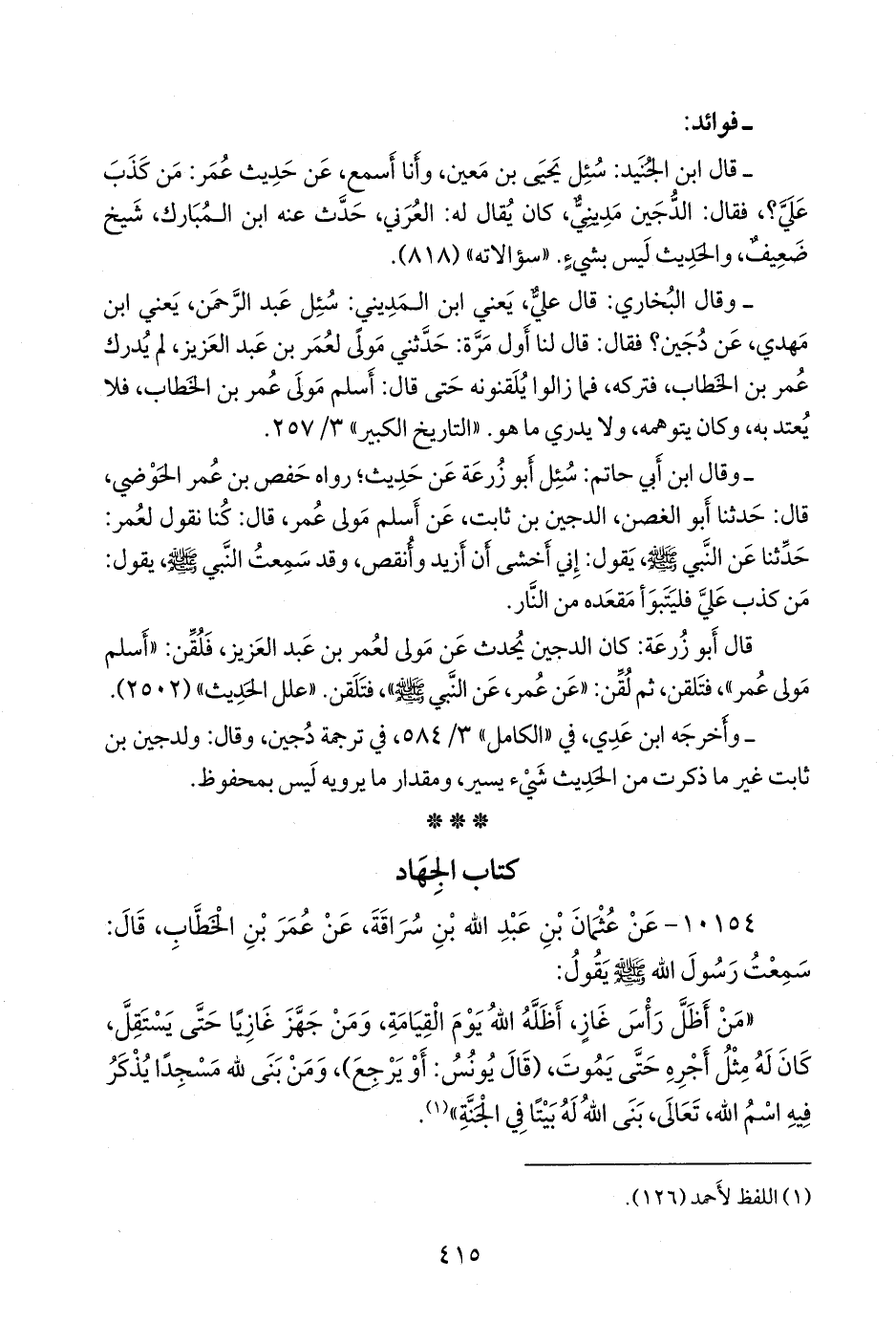 - وقال البخاري: قال علي، يعني ابن المديني: سئل عبد الرَّحمَن، يعني ابن مهدي، عن دجين؟ فقال: قال لنا أول مرة: حدثني مَولًى لعمر بن عبد العزيز، لم يدرك عمر بن الخطاب، فتركه، فما زالوا يلقنونه حتى قال: أسلم مولى عمر بن الخطاب، فلا يعتد به، وكان يتوهمه، ولا يدري ما هو. «التاريخ الكبير» ٣/ ٢٥٧.