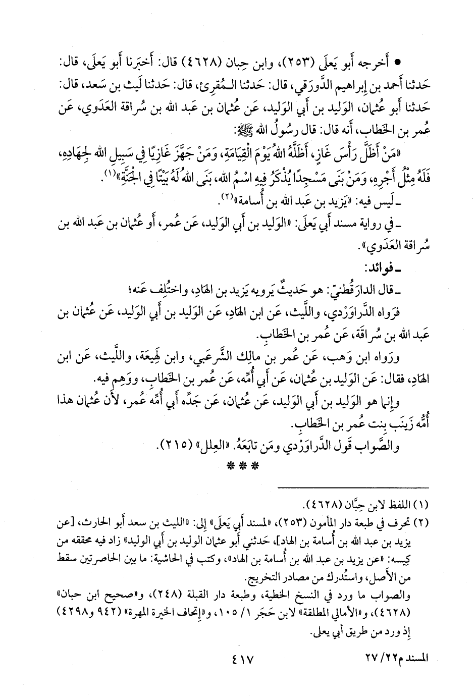 (¬١) تحرف في طبعة دار المأمون لـ «مسند أبي يَعلى» إلى: «حدثنا الليث بن سعد أَبو الحارث، عن يزيد بن عبد الله بن أُسامة بن الهاد، حدثني أَبو عثمان الوليد بن أبي الوليد» زاد فيه محققه من كِيسه: «عن يزيد بن عبد الله بن أُسامة بن الهاد»، وكتب في الحاشية: ما بين الحاصرتين سقط من الأصل، واستُدرك من مصادر التخريج.