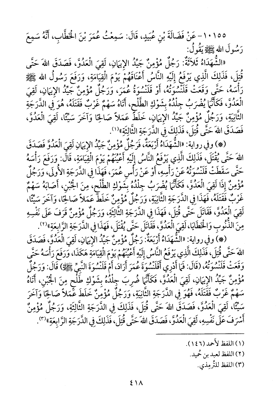 - وفي رواية: «الشهداء أربعة: رجل مؤمن جيد الإيمان، لقي العدو، فصدق الله حتى قتل، فذلك الذي يرفع الناس إليه أعينهم يوم القيامة هكذا، ورفع رأسه حتى وقعت قلنسوته، (قال: فما أدري أقلنسوة عمر أراد، أم قلنسوة النبي صَلى الله عَليه وسَلم) قال: ورجل مؤمن جيد الإيمان، لقي العدو، فكأنما ضرب جلده بشوك طلح من الجبن، أتاه سهم غرب فقتله، فهو في الدرجة الثانية، ورجل مؤمن خلط عملا صالحا وآخر سيئا، لقي العدو، فصدق الله حتى قتل، فذلك في الدرجة الثالثة، ورجل مؤمن أسرف على نفسه، لقي العدو، فصدق الله حتى قتل، فذلك في الدرجة الرابعة» (¬٣).