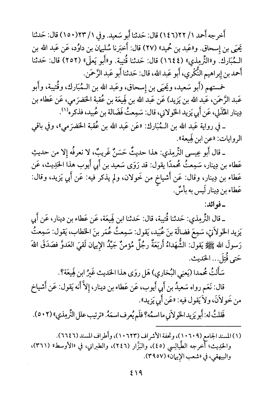 - وقال التِّرمِذي: حدثنا قتيبة، قال: حدثنا ابن لَهِيعة، عن عطاء بن دينار، عن أبي يزيد الخَولاني، سمع فضالة بن عبيد، يقول: سمعت عمر بن الخطاب، يقول: سمعت رسول الله صَلى الله عَليه وسَلم يقول: الشهداء أربعة رجل مؤمن جيد الإيمان لقي العدو فصدق الله حتى قتل، الحديث.