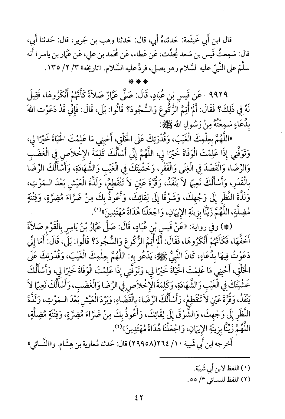 - وفي رواية: «عن قيس بن عُبَاد، قال: صلى عمار بن ياسر بالقوم صلاة أخفها، فكأنهم أنكروها، فقال: ألم أتم الركوع والسجود؟ قالوا: بلى، قال: أما إني دعوت فيها بدعاء، كان النبي صَلى الله عَليه وسَلم يدعو به: اللهم بعلمك الغيب، وقدرتك على الخلق، أحيني ما علمت الحياة خيرًا لي، وتوفني إذا علمت الوفاة خيرًا لي، وأسألك خشيتك في الغيب والشهادة، وكلمة الإخلاص في الرضا والغضب، وأسألك نعيما لا ينفد، وقرة عين لا تنقطع، وأسألك الرضاء بالقضاء، وبرد العيش بعد الموت، ولذة النظر إلى وجهك، والشوق إلى لقائك، وأعوذ بك من ضراء مضرة، وفتنة مضلة، اللهم زينا بزينة الإيمان، واجعلنا هداة مهتدين» (¬٢).