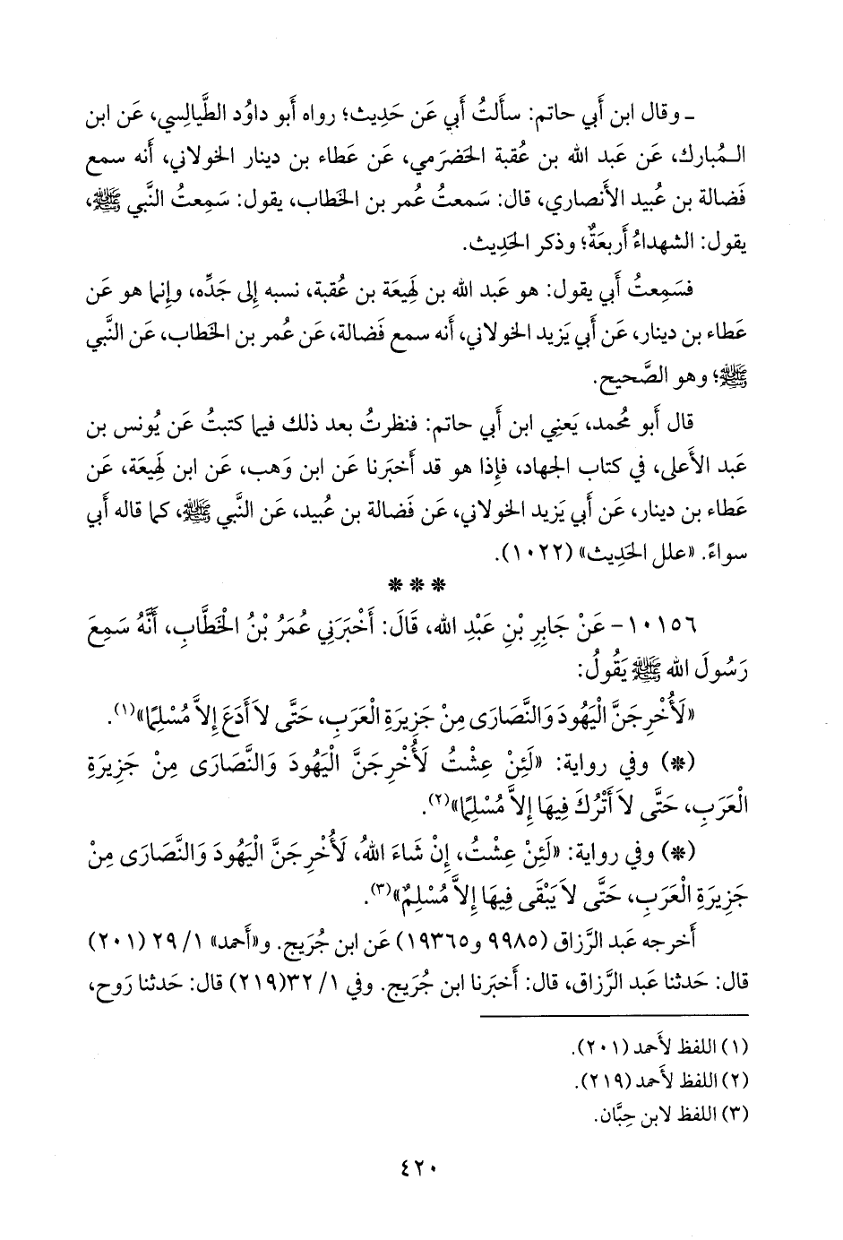 - وفي رواية: «لئن عشت، إن شاء الله، لأخرجن اليهود والنصارى من جزيرة العرب، حتى لا يبقى فيها إلا مسلم» (¬٣).