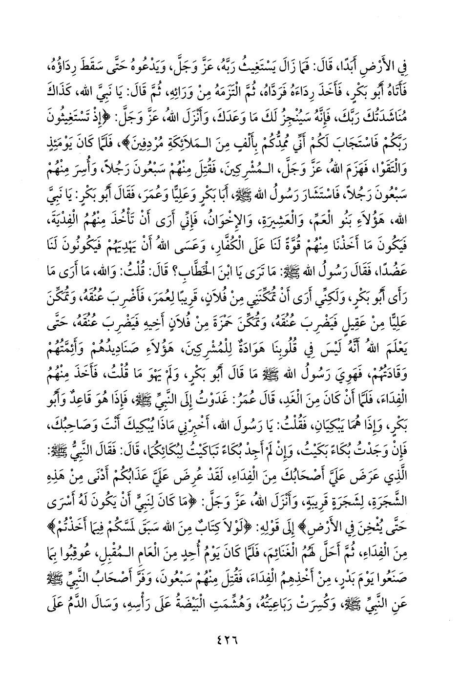 ثم قال: يا نبي الله، كذاك مناشدتك ربك، فإنه سينجز لك ما وعدك، وأنزل الله، عز وجل: {إذ تستغيثون ربكم فاستجاب لكم أني ممدكم بألف من الملائكة مردفين}، فلما كان يومئذ والتقوا، فهزم الله، عز وجل، المشركين، فقتل منهم سبعون رجلا، وأسر منهم سبعون رجلا، فاستشار رسول الله صَلى الله عَليه وسَلم أبا بكر وعليا وعمر، فقال أَبو بكر: يا نبي الله، هؤلاء بنو العم، والعشيرة، والإخوان، فإني أرى أن تأخذ منهم الفدية، فيكون ما أخذنا منهم قوة لنا على الكفار، وعسى الله أن يهديهم فيكونون لنا عضدا، فقال رسول الله صَلى الله عَليه وسَلم: ما ترى يا ابن الخطاب؟ قال: قلت: والله، ما أرى ما رأى أَبو بكر، ولكني أرى أن تمكنني من فلان، قريبا لعمر، فأضرب عنقه، وتمكن عليا من عقيل فيضرب عنقه، وتمكن حمزة من فلان أخيه فيضرب عنقه، حتى يعلم الله أنه ليس في قلوبنا هوادة للمشركين، هؤلاء صناديدهم وأئمتهم وقادتهم، فهوي رسول الله صَلى الله عَليه وسَلم ما قال أَبو بكر، ولم يهو ما قلت، فأخذ منهم الفداء، فلما أن كان من الغد، قال عمر: غدوت إلى النبي صَلى الله عَليه وسَلم فإذا هو قاعد وأَبو بكر، وإذا هما يبكيان، فقلت: يا رسول الله، أخبرني ماذا يبكيك أنت وصاحبك، فإن وجدت بكاء بكيت، وإن لم أجد بكاء تباكيت لبكائكما، قال: فقال النبي صَلى الله عَليه وسَلم: الذي عرض علي أصحابك من الفداء، لقد عرض علي عذابكم أدنى من هذه الشجرة، لشجرة قريبة، وأنزل الله، عز وجل: {ما كان لنبي أن يكون له أسرى حتى يثخن في الأرض} إلى قوله: {لولا كتاب من الله سبق لمسكم فيما أخذتم} من الفداء، ثم أحل لهم الغنائم، فلما كان يوم أُحُد من العام المقبل، عوقبوا بما صنعوا يوم بدر، من أخذهم الفداء، فقتل منهم سبعون، وفر أصحاب النبي صَلى الله عَليه وسَلم عن النبي صَلى الله عَليه وسَلم وكسرت رباعيته، وهشمت البيضة على رأسه، وسال الدم على