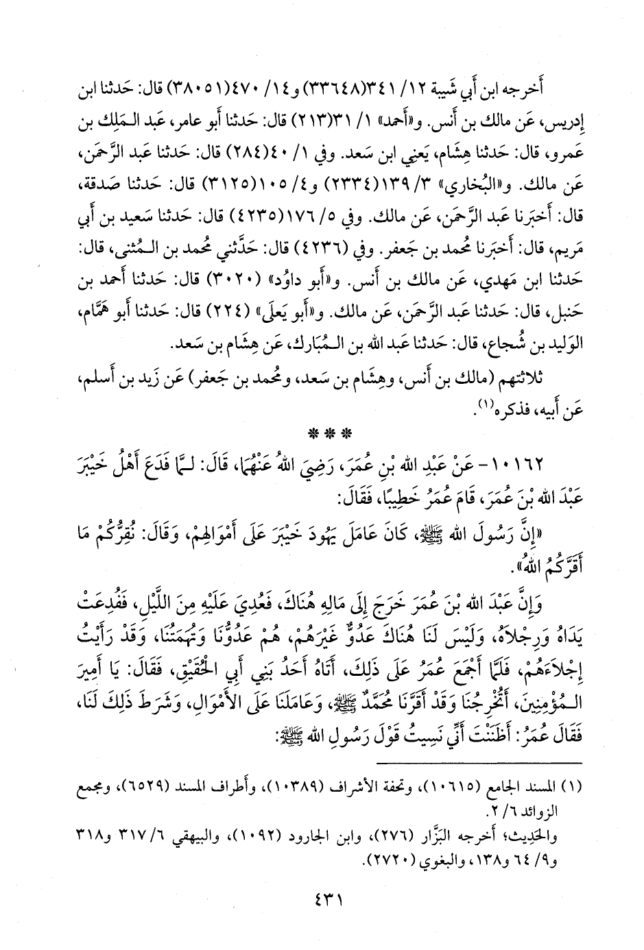 ١٠١٦٢ - عن عبد الله بن عمر، رضي الله عنهما، قال: لما فدع أهل خيبر عبد الله بن عمر، قام عمر خطيبا، فقال: