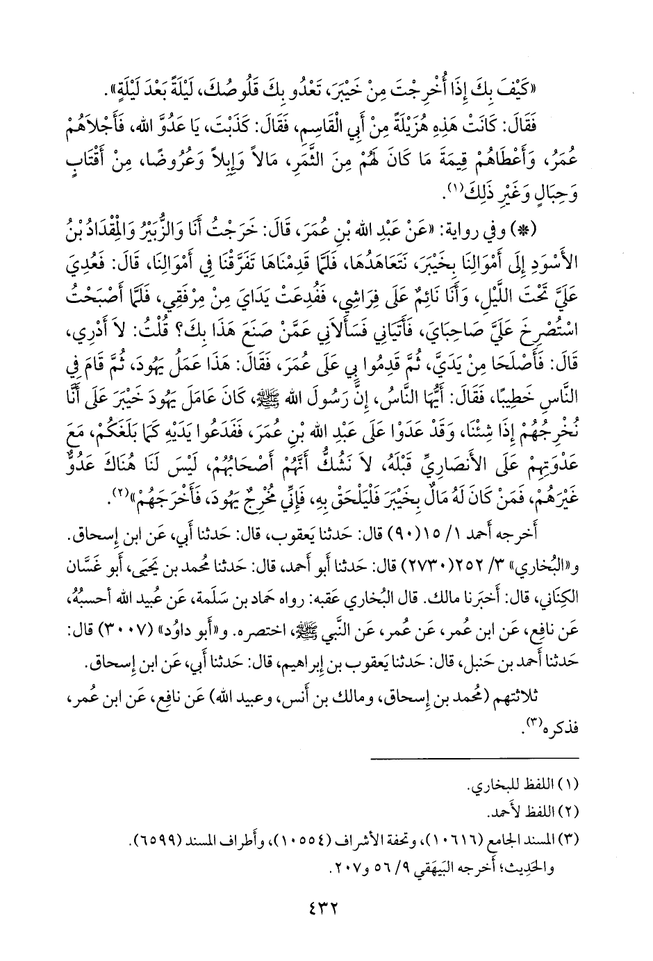 - وفي رواية: «عن عبد الله بن عمر، قال: خرجت أنا والزبير والمقداد بن الأسود إلى أموالنا بخيبر، نتعاهدها، فلما قدمناها تفرقنا في أموالنا، قال: فعدي علي تحت الليل، وأنا نائم على فراشي، ففدعت يداي من مرفقي، فلما أصبحت استصرخ علي صاحباي، فأتياني فسألاني عَمَّن صنع هذا بك؟ قلت: لا أدري، قال: فأصلحا من يدي، ثم قدموا بي على عمر، فقال: هذا عمل يهود، ثم قام في الناس خطيبا، فقال: أيها الناس، إن رسول الله صَلى الله عَليه وسَلم كان عامل يهود خيبر على أنا نخرجهم إذا شئنا، وقد عدوا على عبد الله بن عمر، ففدعوا يديه كما بلغكم، مع عدوتهم على الأَنصاري قبله، لا نشك أنهم أصحابهم، ليس لنا هناك عدو غيرهم، فمن كان له مال بخيبر فليلحق به، فإني مخرج يهود، فأخرجهم» (¬١).