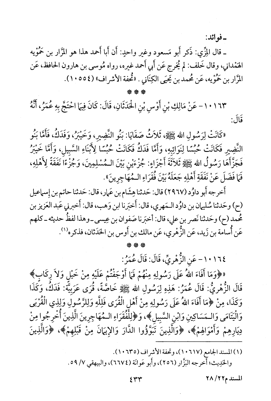 «{وما أفاء الله على رسوله منهم فما أوجفتم عليه من خيل ولا ركاب} قال الزُّهْري: قال عمر: هذه لرسول الله صَلى الله عَليه وسَلم خاصة، قرى عربية: فدك، وكذا وكذا، من {ما أفاء الله على رسوله من أهل القرى فلله وللرسول ولذي القربى واليتامى والمساكين وابن السبيل}، و {للفقراء المهاجرين الذين أخرجوا من ديارهم وأموالهم}، {والذين تبوؤوا الدار والإيمان من قبلهم}، {والذين
