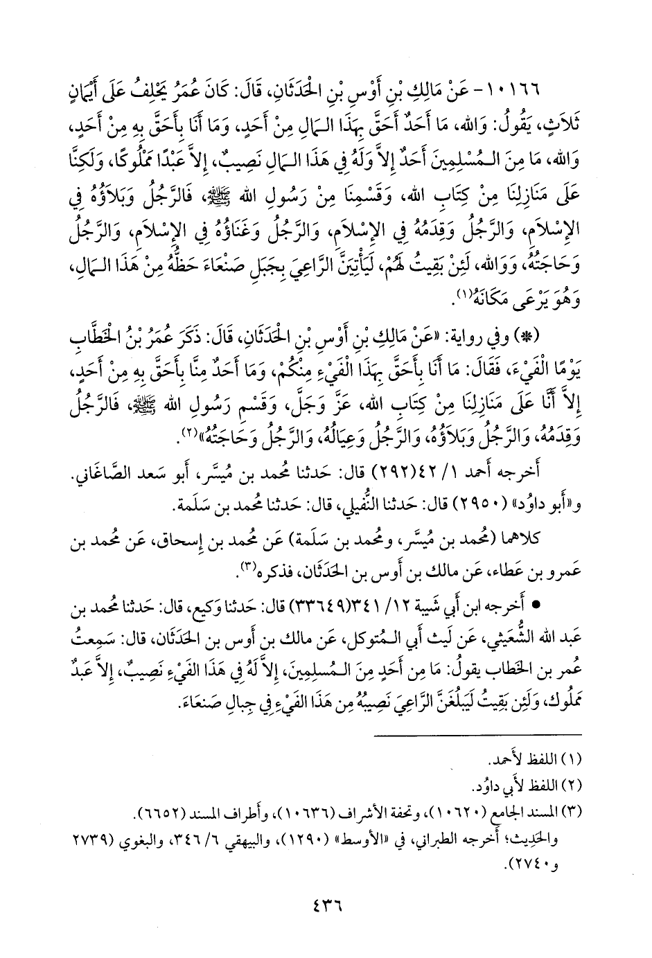 - وفي رواية: «عن مالك بن أوس بن الحدثان، قال: ذكر عمر بن الخطاب يوما الفيء، فقال: ما أنا بأحق بهذا الفيء منكم، وما أحد منا بأحق به من أحد، إلا أنا على منازلنا من كتاب الله، عز وجل، وقسم رسول الله صَلى الله عَليه وسَلم فالرجل وقدمه، والرجل وبلاؤه، والرجل وعياله، والرجل وحاجته» (¬٢).