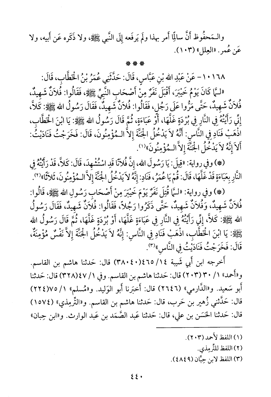 أخرجه ابن أبي شيبة (٣٨٠٤٠) قال: حدثنا هاشم بن القاسم. و «أحمد» (٢٠٣) قال: حدثنا هاشم بن القاسم. وفي ١/ ٤٧ (٣٢٨) قال: حدثنا أَبو سعيد. و «الدَّارِمي» (٢٦٤٦) قال: أخبرنا أَبو الوليد. و «مسلم» ١/ ٧٥ (٢٢٤) قال: حدثني زهير بن حرب، قال: حدثنا هاشم بن القاسم. و «التِّرمِذي» (١٥٧٤) قال: حدثنا الحسن بن علي، قال: حدثنا عبد الصمد بن عبد الوارث. و «ابن حِبَّان»