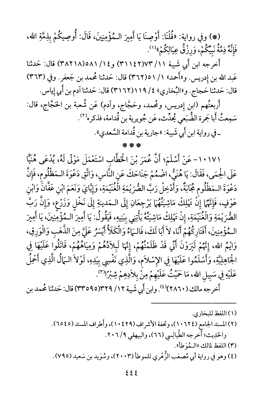 ١٠١٧١ - عن أسلم؛ أن عمر بن الخطاب استعمل مَولًى له، يدعى هنيا على الحمى، فقال: يا هني، اضمم جناحك عن الناس، واتق دعوة المظلوم، فإن دعوة المظلوم مجابة، وأدخل رب الصريمة الغنيمة، وإياي ونعم ابن عفان وابن عوف، فإنهما إن تهلك ماشيتهما يرجعان إلى المدينة إلى نخل وزرع، وإن رب الصريمة والغنيمة، إن تهلك ماشيته يأتني ببنيه، فيقول: يا أمير المؤمنين، يا أمير المؤمنين، أفتاركهم أنا، لا أبا لك، فالماء والكلأ أيسر علي من الذهب والورق، وايم الله، إنهم ليرون أني قد ظلمتهم، إنها لبلادهم ومياههم، قاتلوا عليها في الجاهلية، وأسلموا عليها في الإسلام، والذي نفسي بيده، لولا المال الذي أحمل عليه في سبيل الله، ما حميت عليهم من بلادهم شبرا (¬١).