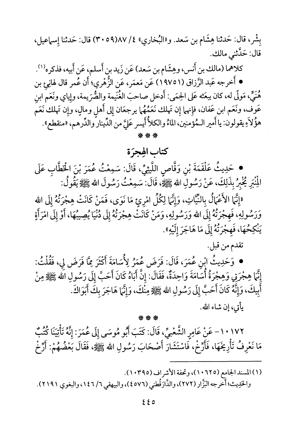 «إنما الأعمال بالنيات، وإنما لكل امرئ ما نوى، فمن كانت هجرته إلى الله ورسوله، فهجرته إلى الله ورسوله، ومن كانت هجرته إلى دنيا يصيبها، أو إلى امرأة ينكحها، فهجرته إلى ما هاجر إليه».