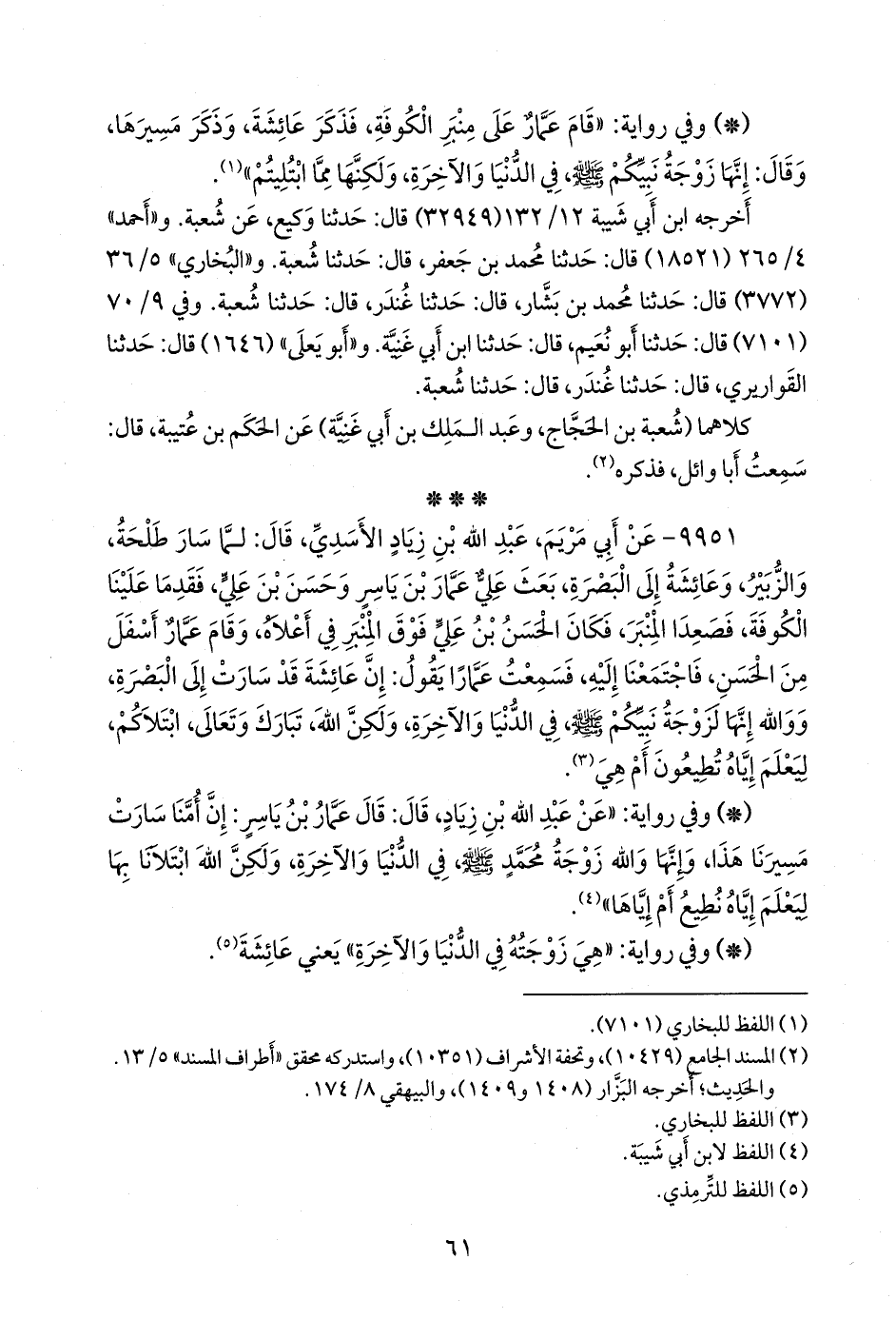 - وفي رواية: «عن عبد الله بن زياد الأسدي، قال: سمعتُ عمار بن ياسر يقول: هي زوجته في الدنيا والآخرة يعني عائشة» (¬٣).