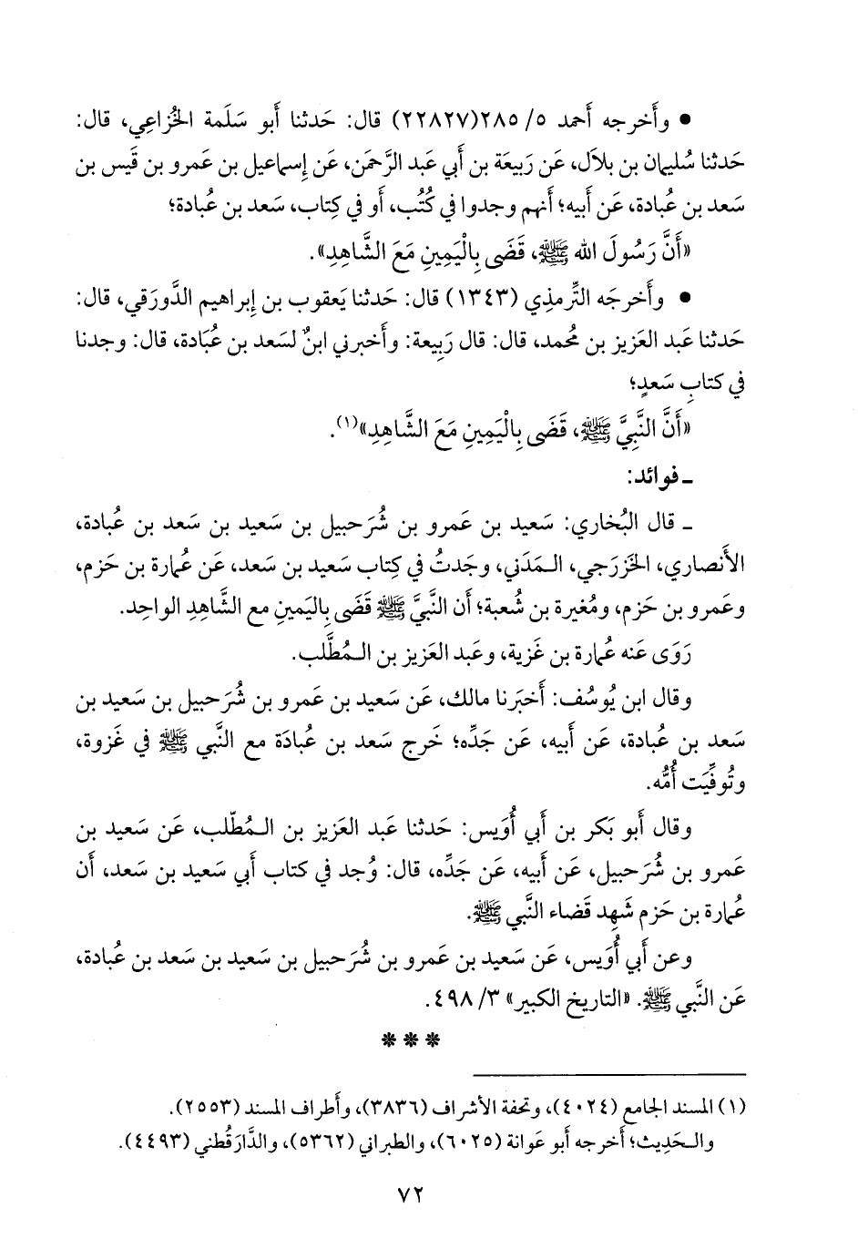 - قال البخاري: سعيد بن عَمرو بن شُرحبيل بن سعيد بن سعد بن عُبادة، الأَنصاري، الخَزرَجي، المدني، وجَدتُ في كتاب سعيد بن سعد، عن عُمارة بن حَزم، وعَمرو بن حَزم، ومغيرة بن شعبة؛ أَن النبي صَلى الله عَليه وسَلم قَضَى باليمينِ مع الشَّاهِدِ الواحد.