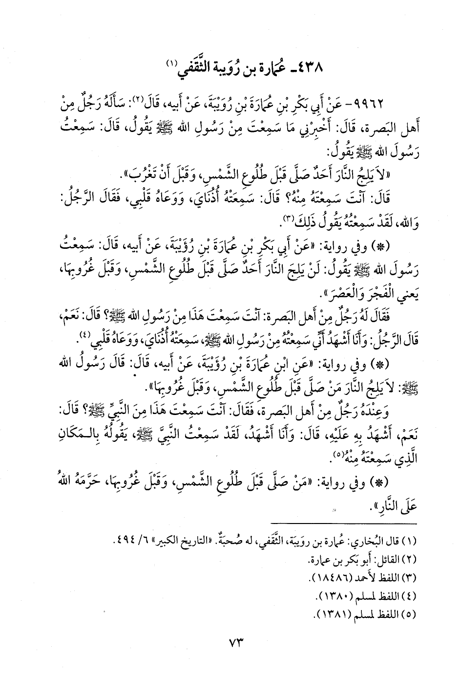 - وفي رواية: «عن ابن عمارة بن رؤيبة، عن أبيه، قال: قال رسول الله صَلى الله عَليه وسَلم: لا يلج النار من صلى قبل طلوع الشمس، وقبل غروبها».