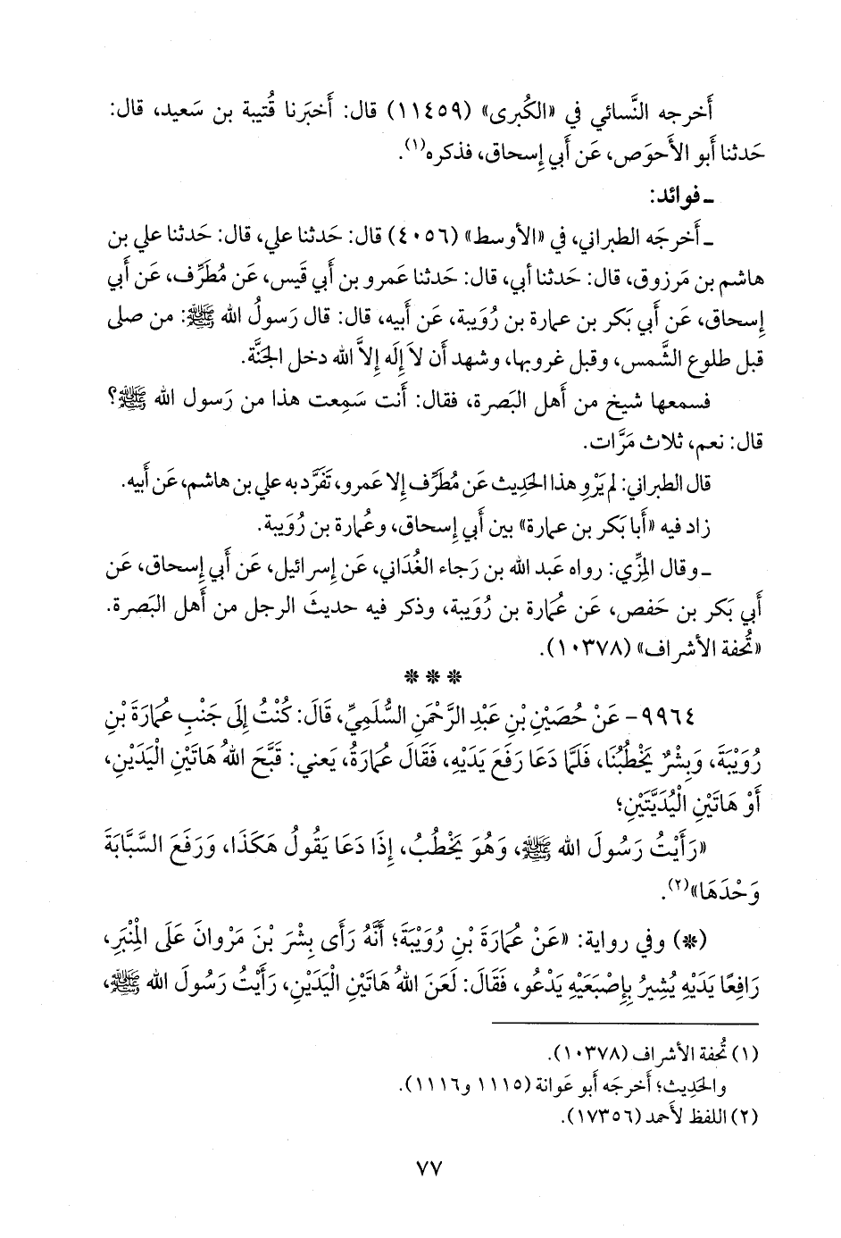 - وفي رواية: «عن عمارة بن رويبة؛ أنه رأى بشر بن مروان على المنبر، رافعا يديه يشير بإصبعيه يدعو، فقال: لعن الله هاتين اليدين، رأيت رسول الله صَلى الله عَليه وسَلم
