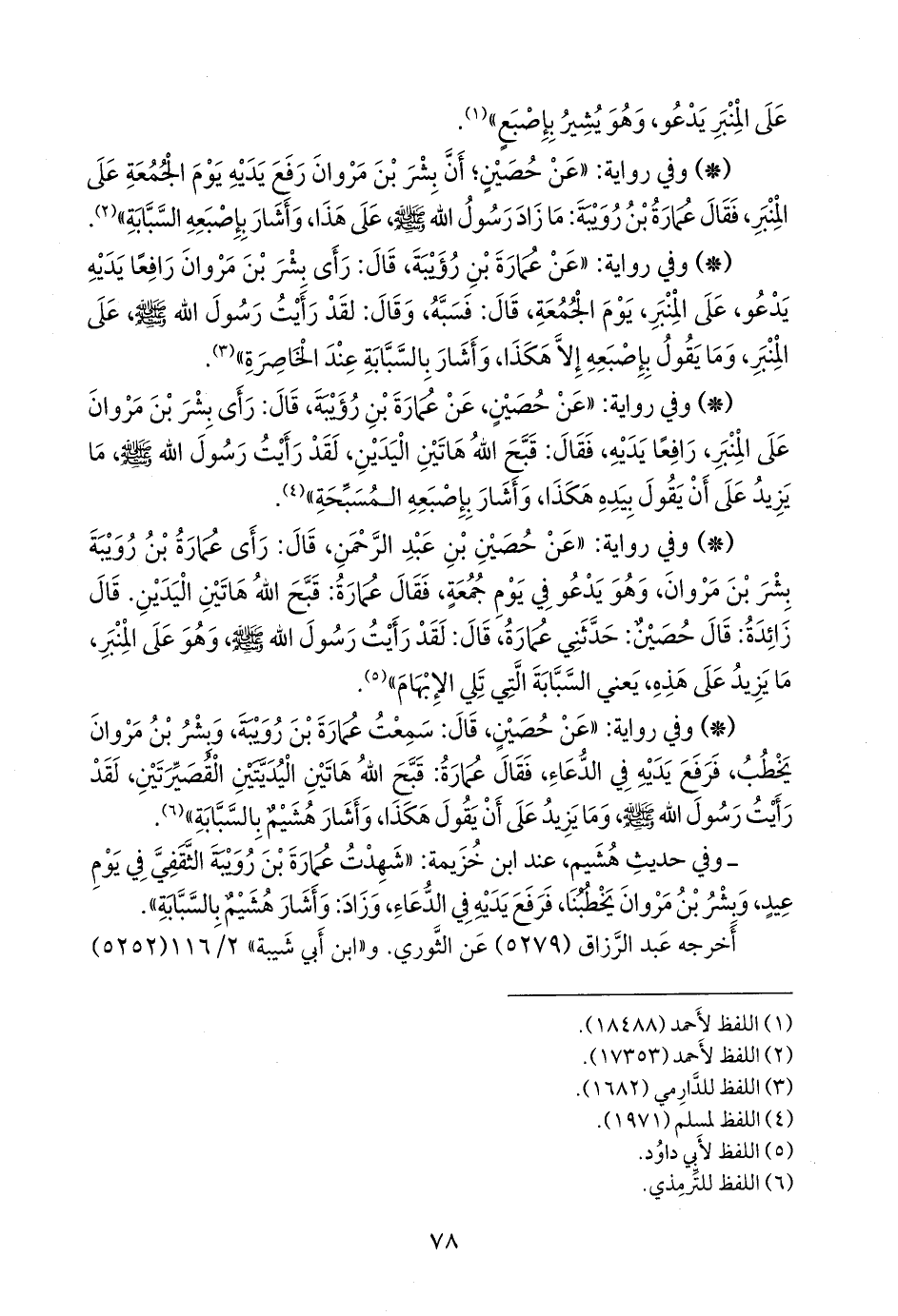 - وفي رواية: «عن حصين بن عبد الرَّحمَن، قال: رأى عمارة بن رويبة بشر بن مروان، وهو يدعو في يوم جمعة، فقال عمارة: قبح الله هاتين اليدين. قال زائدة: قال حصين: حدثني عمارة، قال: لقد رأيت رسول الله صَلى الله عَليه وسَلم وهو على المنبر، ما يزيد على هذه، يعني السبابة التي تلي الإبهام» (¬١).