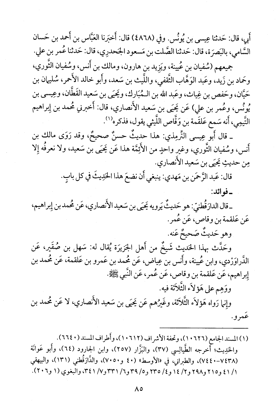 - قال الدارقُطني: هو حديثٌ يرويه يحيى بن سعيد الأَنصاري، عن محمد بن إبراهيم، عن علقمة بن وقاص، عن عمر.
