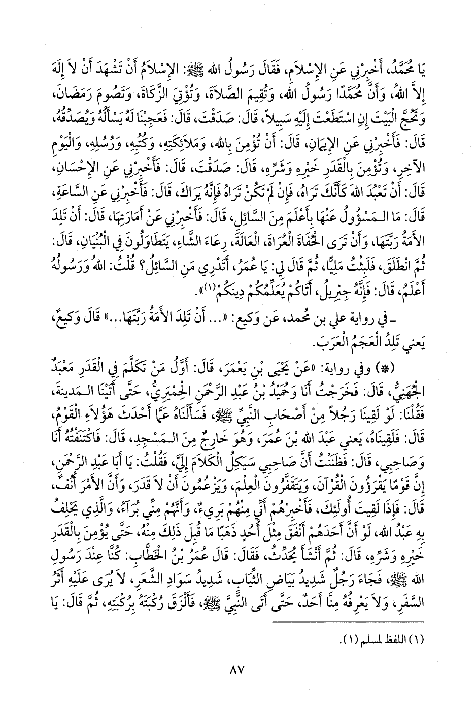 - وفي رواية: «عن يحيى بن يَعمَر، قال: أول من تكلم في القدر معبد الجهني، قال: فخرجت أنا وحميد بن عبد الرَّحمَن الحميري، حتى أتينا المدينة، فقلنا: لو لقينا رجلا من أصحاب النبي صَلى الله عَليه وسَلم فسألناه عما أحدث هؤلاء القوم، قال: فلقيناه، يعني عبد الله بن عمر، وهو خارج من المسجد، قال: فاكتنفته أنا وصاحبي، قال: فظننت أن صاحبي سيكل الكلام إلي، فقلت: يا أبا عبد الرَّحمَن، إن قوما يقرؤون القرآن، ويتقفرون العلم، ويزعمون أن لا قدر، وأن الأمر أنف، قال: فإذا لقيت أولئك، فأخبرهم أني منهم بريء، وأنهم مني برآء، والذي يحلف به عبد الله، لو أن أحدهم أنفق مثل أحد ذهبا ما قبل ذلك منه، حتى يؤمن بالقدر خيره وشره، قال: ثم أنشأ يحدث، فقال: قال عمر بن الخطاب: كنا عند رسول الله صَلى الله عَليه وسَلم فجاء رجل شديد بياض الثياب، شديد سواد الشعر، لا يرى عليه أثر السفر، ولا يعرفه منا أحد، حتى أتى النبي صَلى الله عَليه وسَلم فألزق ركبته بركبته، ثم قال: يا