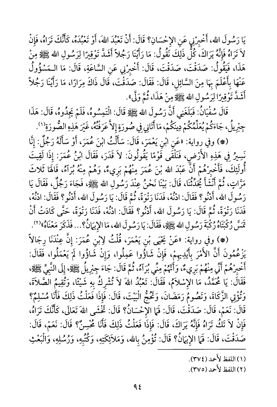 - وفي رواية: «عن يحيى بن يَعمَر, قلت لابن عمر: إن عندنا رجالا يزعمون أن الأمر بأيديهم، فإن شاؤوا عملوا، وإن شاؤوا لم يعملوا، فقال: أخبرهم أني منهم بريء، وأنهم مني برآء، ثم قال: جاء جبريل صَلى الله عَليه وسَلم إلى النبي صَلى الله عَليه وسَلم فقال: يا محمد، ما الإسلام، فقال: تعبد الله لا تشرك به شيئا، وتقيم الصلاة، وتؤتي الزكاة، وتصوم رمضان، وتحج البيت، قال: فإذا فعلت ذلك فأنا مسلم؟ قال: نعم، قال: صدقت، قال: فما الإحسان؟ قال: تخشى الله تعالى، كأنك تراه، فإن لا تك تراه فإنه يراك، قال: فإذا فعلت ذلك فأنا محسن؟ قال: نعم، قال: صدقت، قال: فما الإيمان؟ قال: تؤمن بالله، وملائكته، وكتبه، ورسله، والبعث
