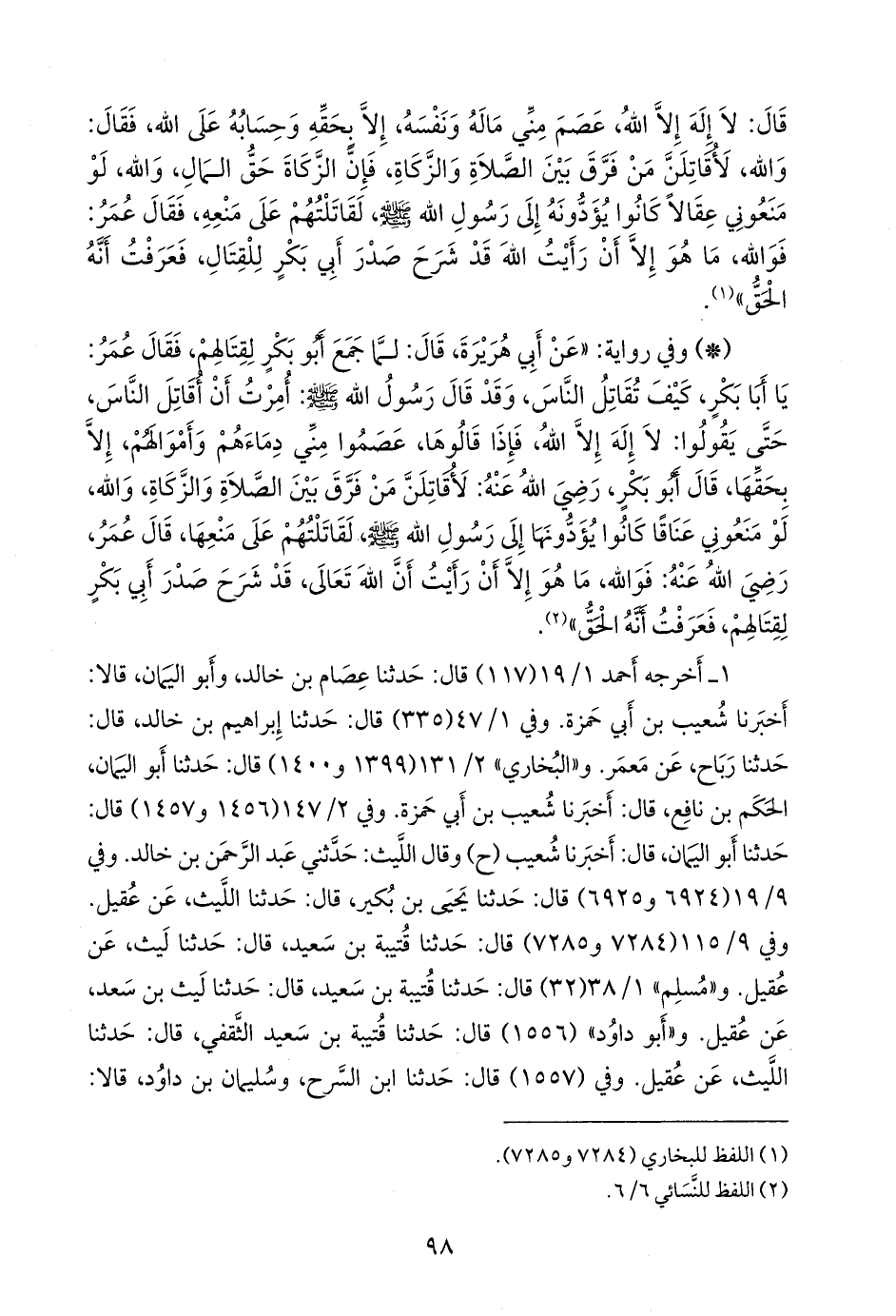 - وفي رواية: «عن أبي هريرة، قال: لما جمع أَبو بكر لقتالهم، فقال عمر: يا أبا بكر، كيف تقاتل الناس، وقد قال رسول الله صَلى الله عَليه وسَلم: أمرت أن أقاتل الناس، حتى يقولوا: لا إله إلا الله، فإذا قالوها، عصموا مني دماءهم وأموالهم، إلا بحقها، قال أَبو بكر، رضي الله عنه: لأقاتلن من فرق بين الصلاة والزكاة، والله، لو منعوني عَناقًا كانوا يؤدونها إلى رسول الله صَلى الله عَليه وسَلم لقاتلتهم على منعها، قال عمر، رضي الله عنه: فوالله، ما هو إلا أن رأيت أن الله تعالى، قد شرح صدر أَبي بكر لقتالهم، فعرفت أنه الحق» (¬١).
