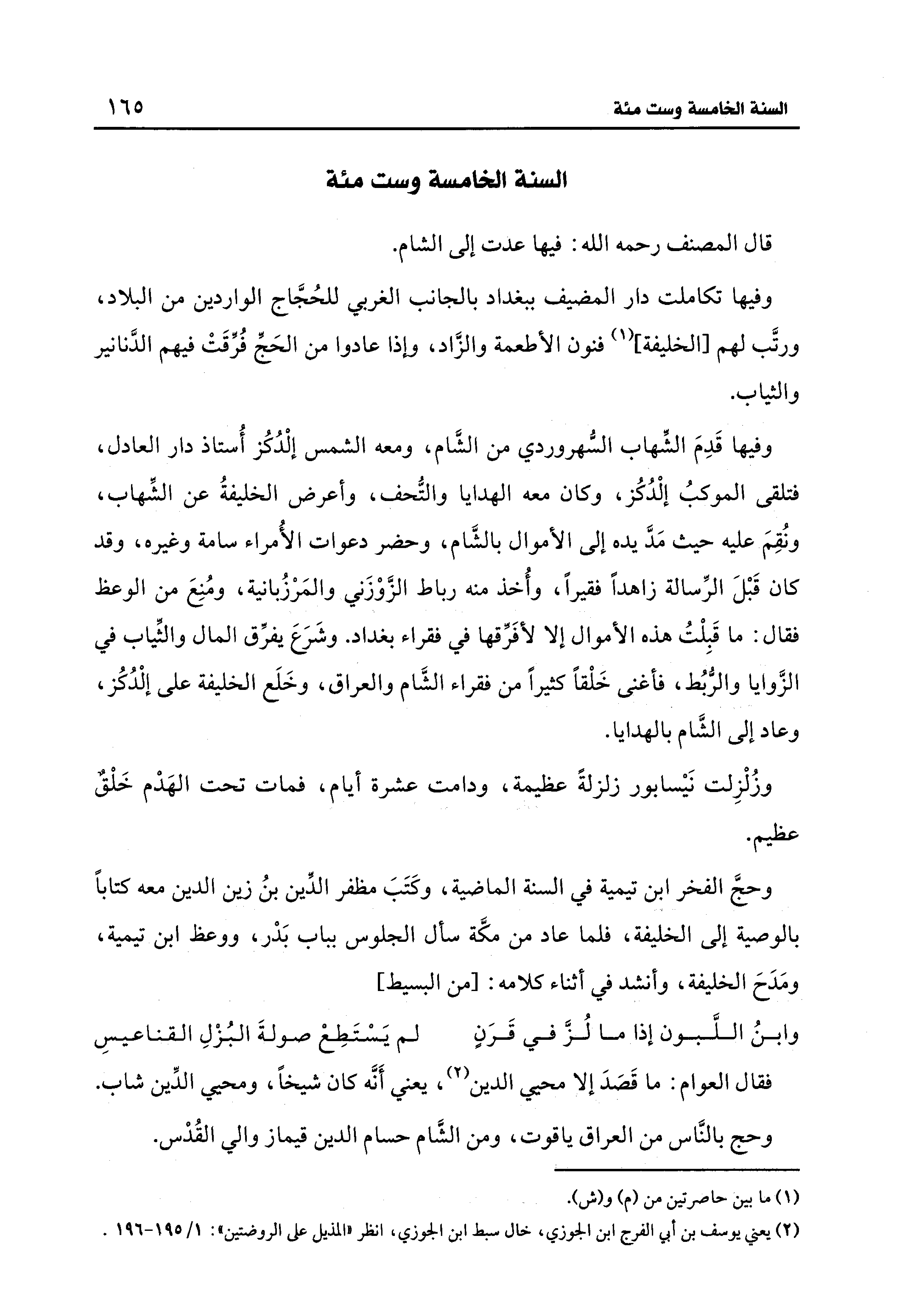 وحجَّ الفخر ابن تيمية في السنة الماضية، وكَتَبَ مظفر الدِّين بنُ زين الدين معه كتابًا بالوصية إلى الخليفة، فلما عاد من مكَّة سأل الجلوس بباب بَدْر، ووعظ ابن تيمية، ومَدَحَ الخليفة، وأنشد في أثناء كلامه: [من البسيط]