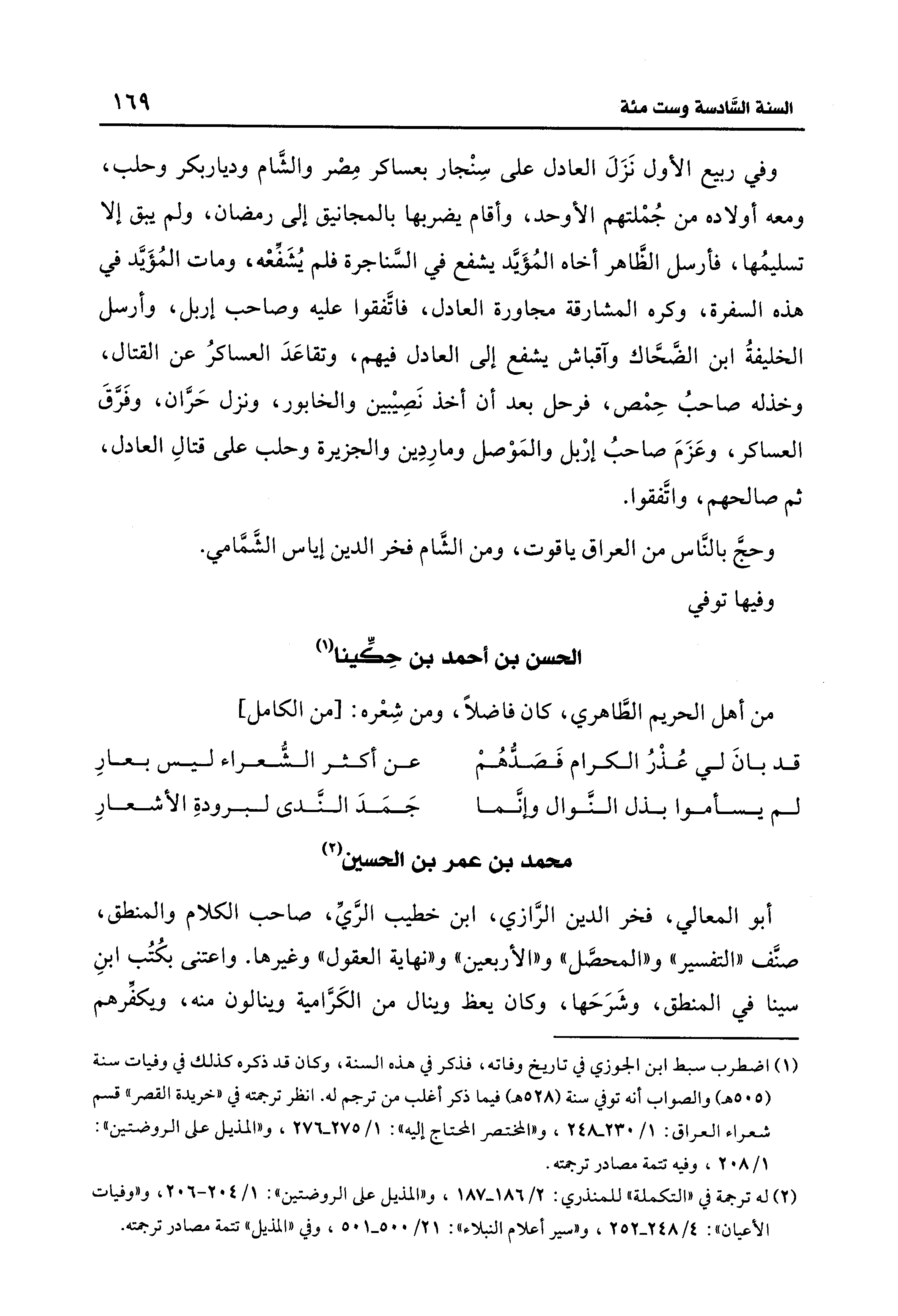 (¬1) اضطرب سبط ابن الجوزي في تاريخ وفاته، فذكر في هذه السنة، وكان قد ذكره كذلك في وفيات سنة (505 هـ) والصواب أنه توفي سنة (528 هـ) فيما ذكر أغلب من ترجم له. انظر ترجمته في "خريدة القصر" قسم شعراء العراق: 1/ 230 - 248، و"المختصر المحتاج إليه": 1/ 275 - 276، و"المذيل على الروضتين": 1/ 208، وفيه تتمة مصادر ترجمته.