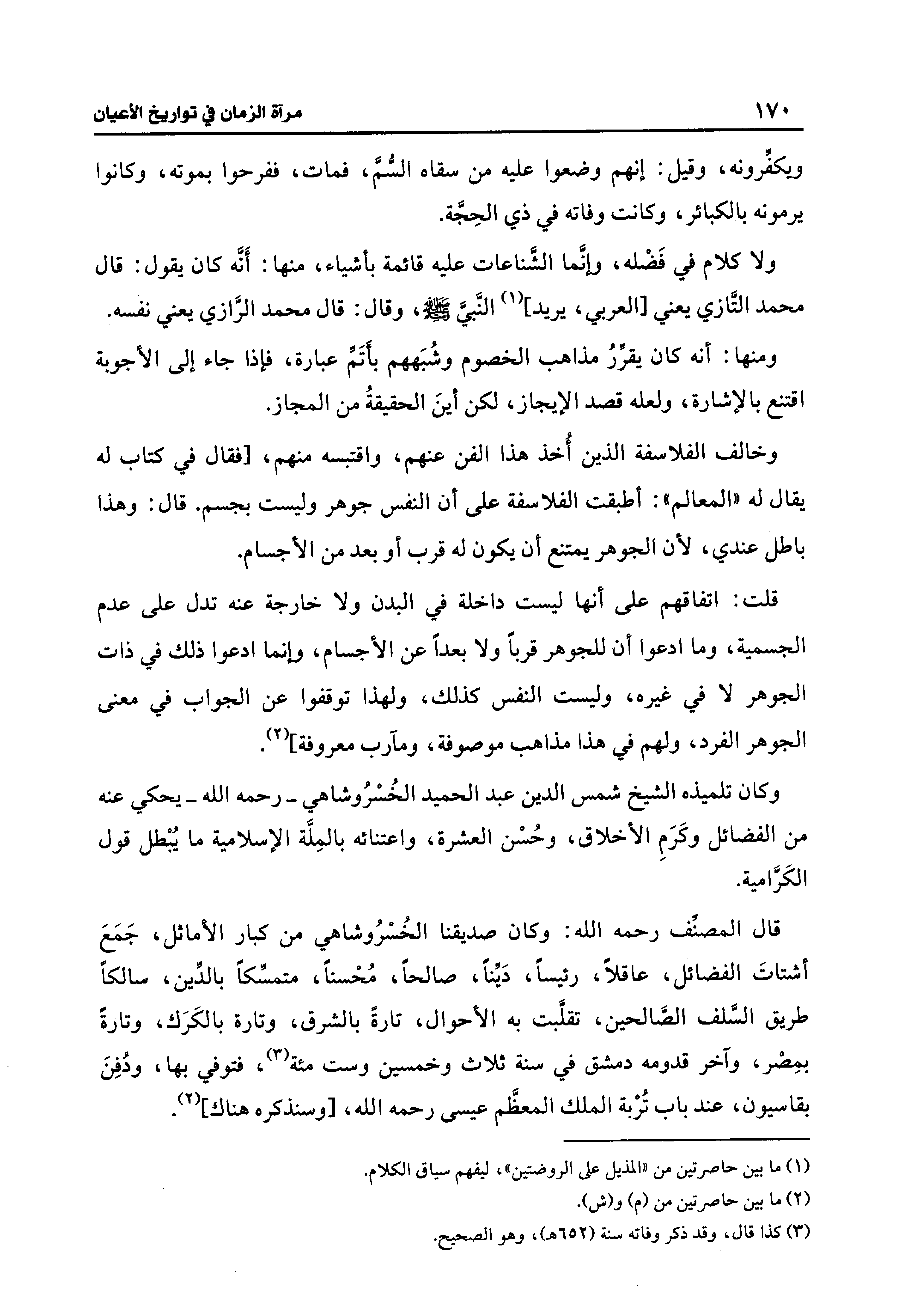 قال المصنف رحمه الله: وكان صديقنا الخُسْرُوشاهي من كبار الأماثل، جَمَعَ أشتاتَ الفضائل، عاقلًا، رئيسًا، دَيِّنًا، صالحًا، مُحْسنًا، متمسِّكًا بالدِّين، سالكًا طريق السَّلف الضَالحين، تقلَّبت به الأحوال، تارةً بالشرق، وتارة بالكَرَك، وتارةً بمِصْر، وآخر قدومه دمشق في سنة ثلاث وخمسين وست مئة (¬3)، فتوفي بها، ودُفِنَ بقاسيون، عند باب تُرْبة الملك المعظَّم عيسى رحمه الله، [وسنذكره هناك] (2).