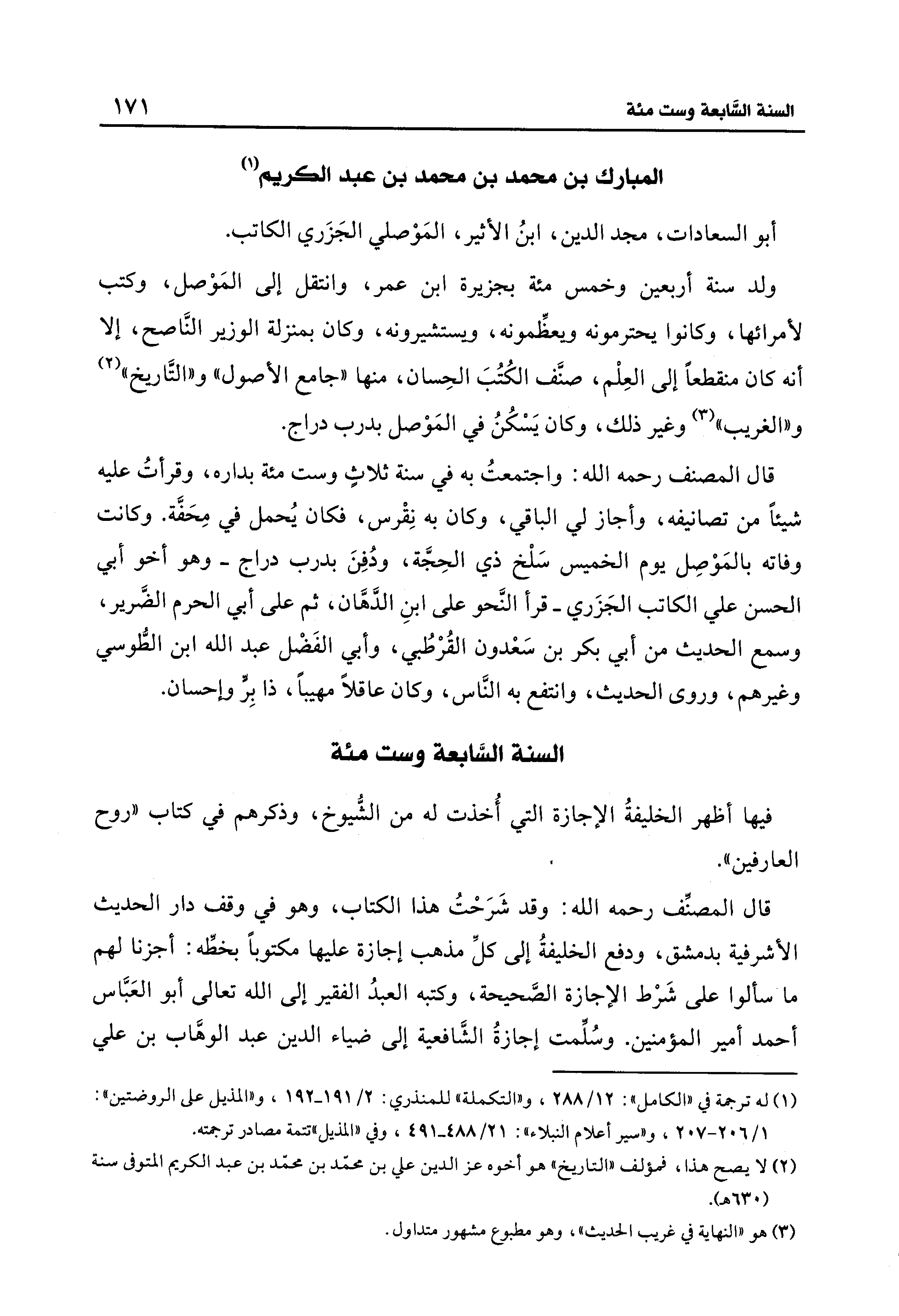 قال المصنف رحمه الله: واجتمعتُ به في سنة ثلاثِ وست مئة بداره، وقرأتُ عليه شيئًا من تصانيفه، وأجاز لي الباقي، وكان به نِقْرس، فكان يُحمل في مِحَفَّة. وكانت وفاته بالمَوْصِل يوم الخميس سَلْخ ذي الحِجَّة، ودُفِنَ بدرب دراج -وهو أخو أبي الحسن علي الكاتب الجَزَري- قرأ النَّحو على ابنِ الدَّهَّان، ثم على أبي الحرم الضَّرير، وسمع الحديث من أبي بكر بن سَعْدون القُرْطُبي، وأبي الفَضْل عبد الله بن الطُّوسي وغيرهم، وروى الحديث، وانتفع به النَّاس، وكان عاقلًا مهيبًا، ذا بِرٍّ وإحسان.