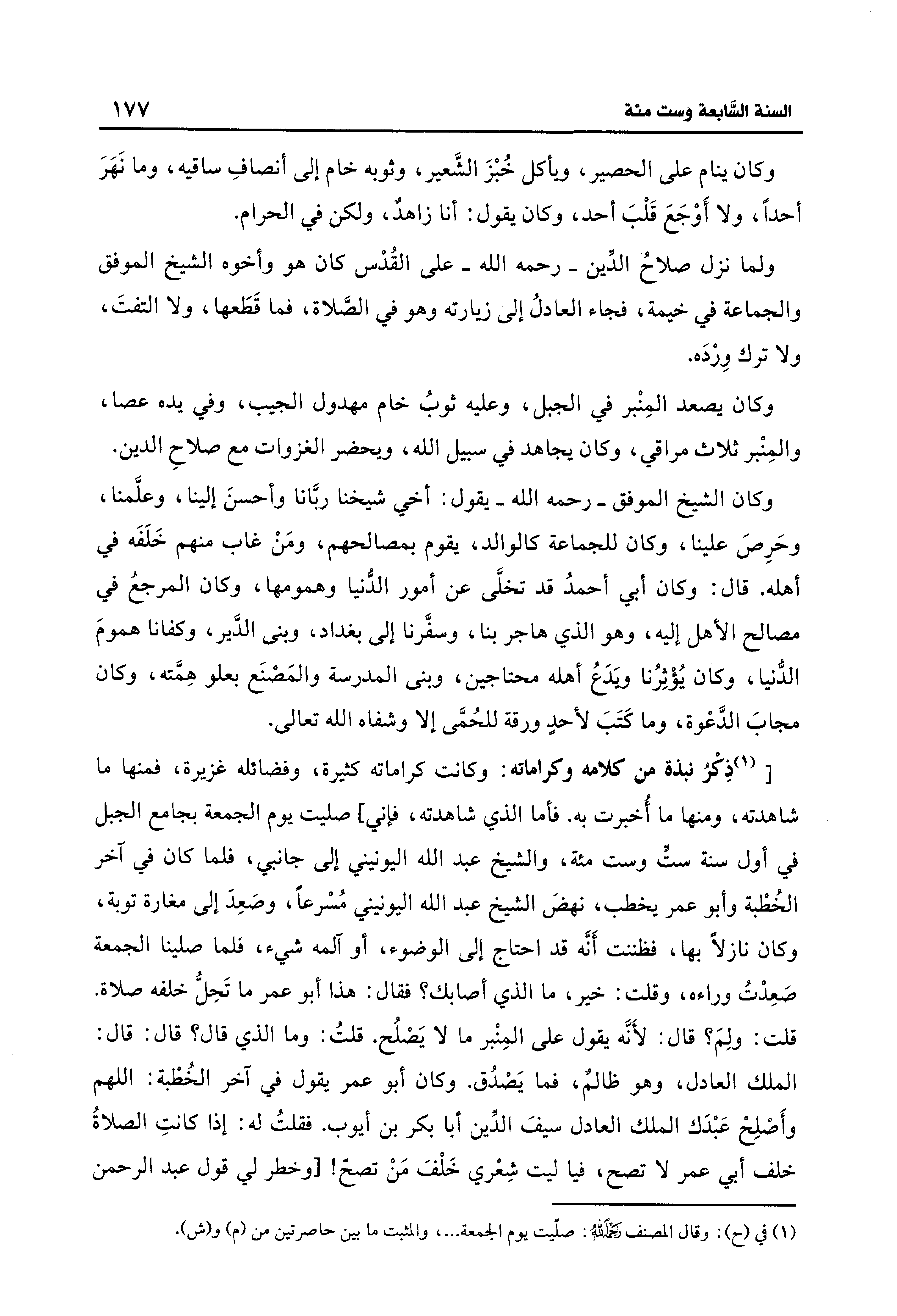 [(¬1) ذِكْرُ نبذة من كلامه وكراماته: وكانت كراماته كثيرة، وفضائله غزيرة، فمنها ما شاهدته، ومنها ما أُخبرت به. فأما الذي شاهدته، فإني] صليت يوم الجمعة بجامع الجبل في أول سنة ستٍّ وست مئة، والشيخ عبد الله اليونيني إلى جانبي، فلما كان في آخر الخُطْبة وأبو عمر يخطب، نهضَ الشيخ عبد الله اليونيني مُسْرعًا، وصَعِدَ إلى مغارة توبة، وكان نازلًا بها، فظننت أَنَّه قد احتاج إلى الوضوء، أو آلمه شيء، فلما صلينا الجمعة صَعِدْتُ وراءه، وقلت: خير، ما الذي أصابك؟ فقال: هذا أبو عمر ما تَحِلُّ خلفه صلاة. قلت: ولمَ؟ قال: لأَنَّه يقول على المِنْبر ما لا يَصْلُح. قلتُ: وما الذي قال: قال: قال: الملك العادل، وهو ظالمٌ، فما يَصْدُق. وكان أبو عمر يقول في آخر الخُطْبة: اللهم وأَصْلِحْ عَبْدَك الملك العادل سيفَ الدِّين أبا بكر بن أيوب. فقلتُ له: إذا كانتِ الصلاةُ خلف أبي عمر لا تصح، فيا ليت شِعْري خَلْفَ مَنْ تصحّ! [وخطر لي قول عبد الرحمن