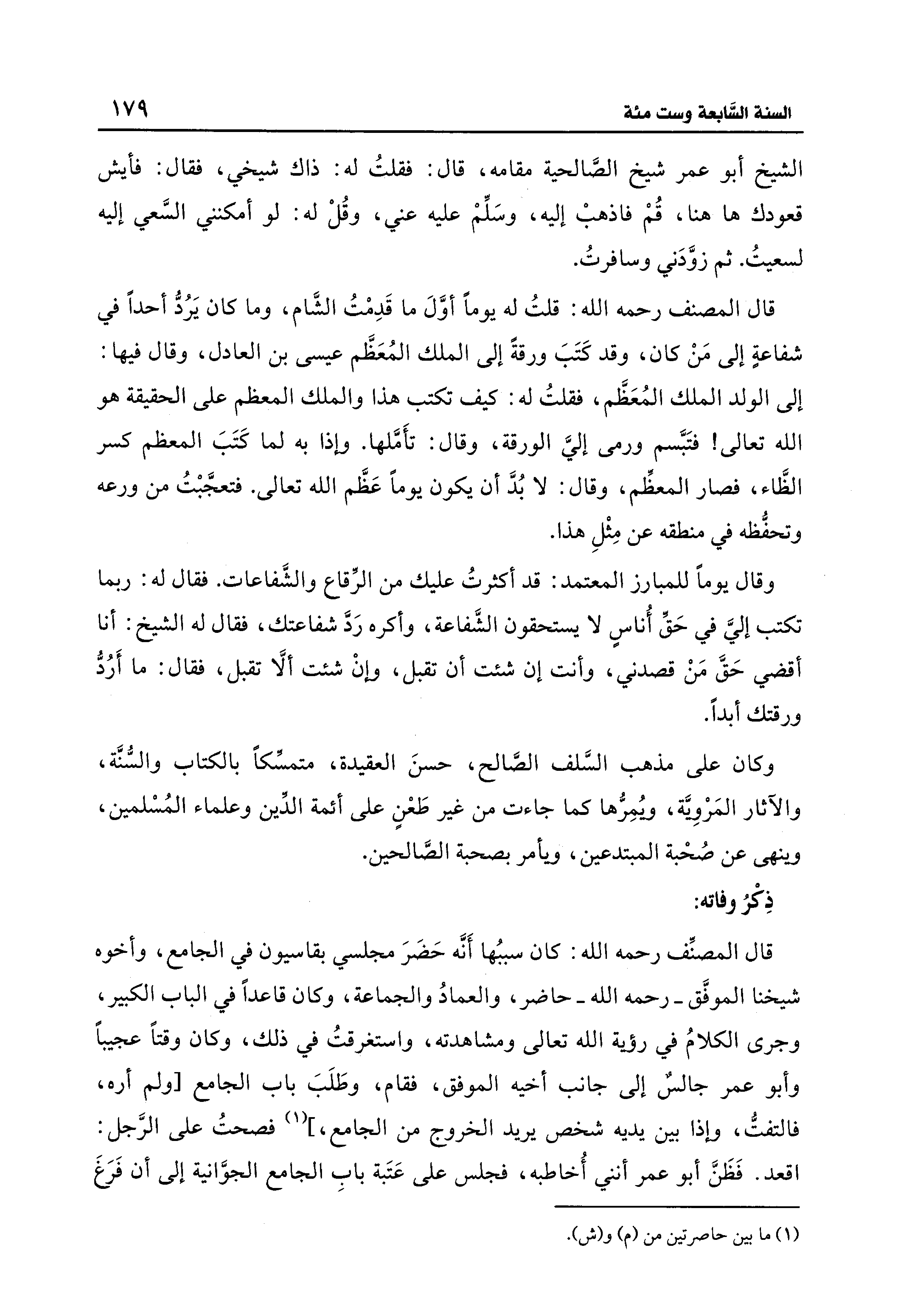الشيخ أبو عمر شيخ الصَّالحية مقامه، قال: فقلتُ له: ذاك شيخي، فقال: فأيش قعودك ها هنا، قُمْ فاذهبْ إليه، وسَلِّمْ عليه عني، وقُلْ له: لو أمكنني السَّعي إليه لسعيتُ. ثم زوَّدَني وسافرتُ.