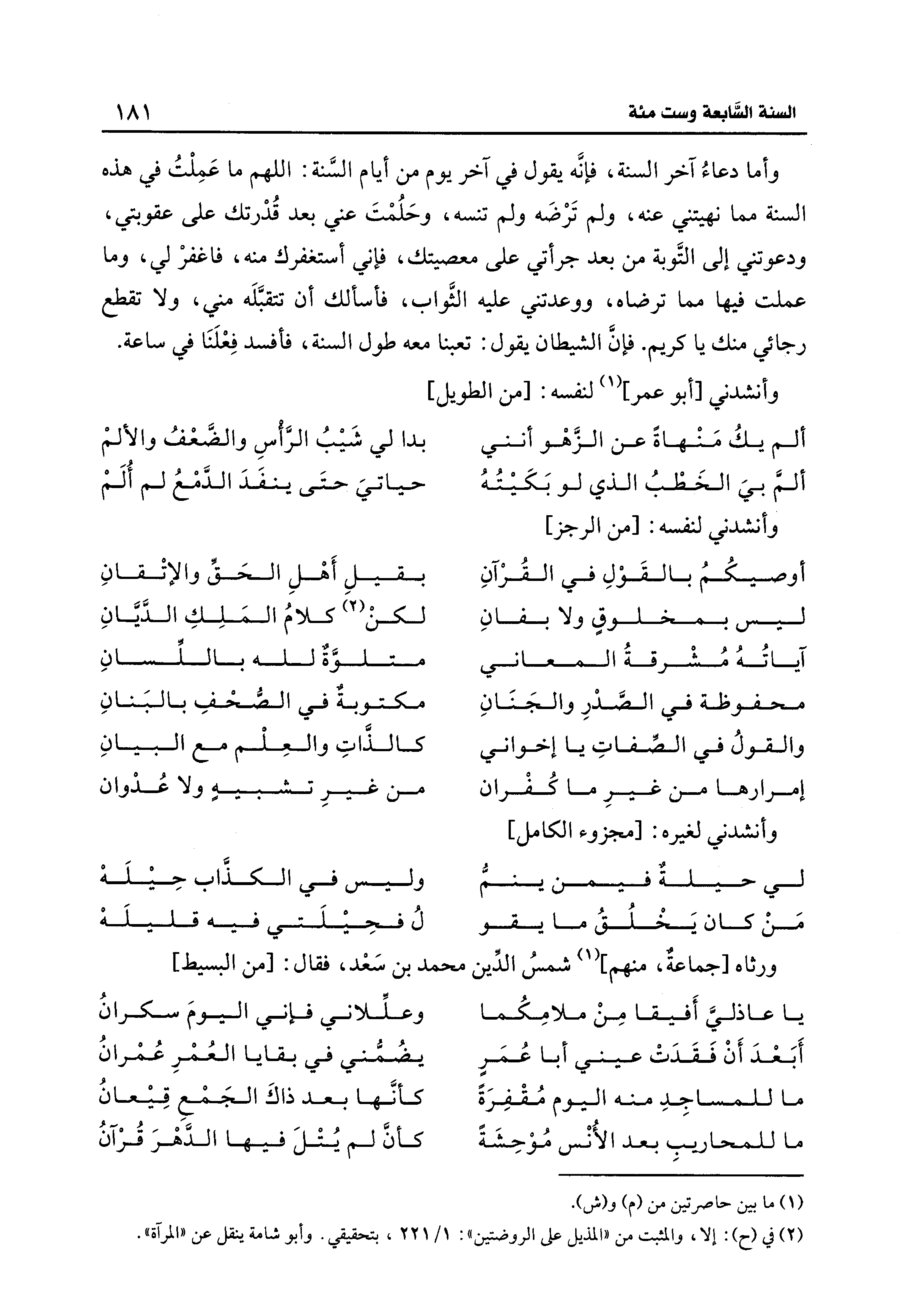 وأما دعاءُ آخر السنة، فإنَّه يقول في آخر يوم من أيام السَّنة: اللهم ما عَمِلْتُ في هذه السنة مما نهيتني عنه، ولم تَرْضَه ولم تنسه، وحَلُمْتَ عني بعد قُدْرتك على عقوبتي، ودعوتني إلى التَّوبة من بعد جرأتي على معصيتك، فإني أستغفرك منه، فاغفرْ لي، وما عملت فيها مما ترضاه، ووعدتني عليه الثَّواب، فأسألك أن تتقبَّلَه مني، ولا تقطع رجائي منك يا كريم. فإنَّ الشيطان يقول: تعبنا معه طول السنة، فأفسد فِعْلَنَا في ساعة.