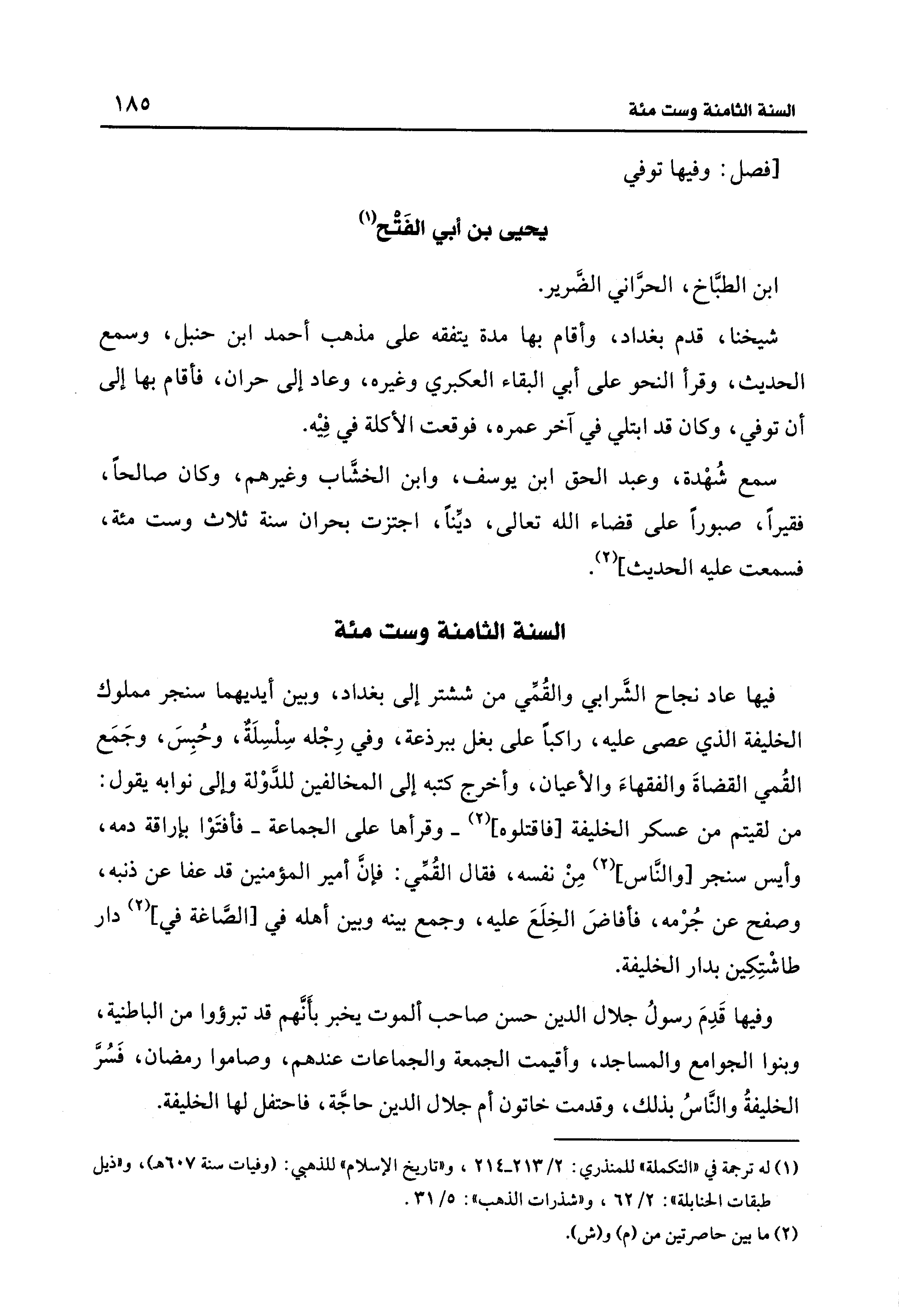 فيها عاد نجاح الشَّرابي والقُمِّي من ششتر إلى بغداد، وبين أيديهما سنجر مملوك الخليفة الذي عصى عليه، راكبًا على بغل ببرذعة، وفي رِجْله سِلْسِلَةٌ، وحُبِسَ، وجَمَع القُمي القضاةَ والفقهاءَ والأعيان، وأخرج كتبه إلى المخالفين للدَّوْلة وإلى نوابه يقول: من لقيتم من عسكر الخليفة [فاقتلوه] (2) -وقرأها على الجماعة- فأفتَوْا بإراقة دمه، وأيس سنجر [والنَّاس] (2) مِنْ نفسه، فقال القُمِّي: فإنَّ أمير المؤمنين قد عفا عن ذنبه، وصفح عن جُرْمه، فأفاضَ الخِلَعَ عليه، وجمع بينه وبين أهله في [الصَّاغة في] (2) دار طاشْتِكِين بدار الخليفة.