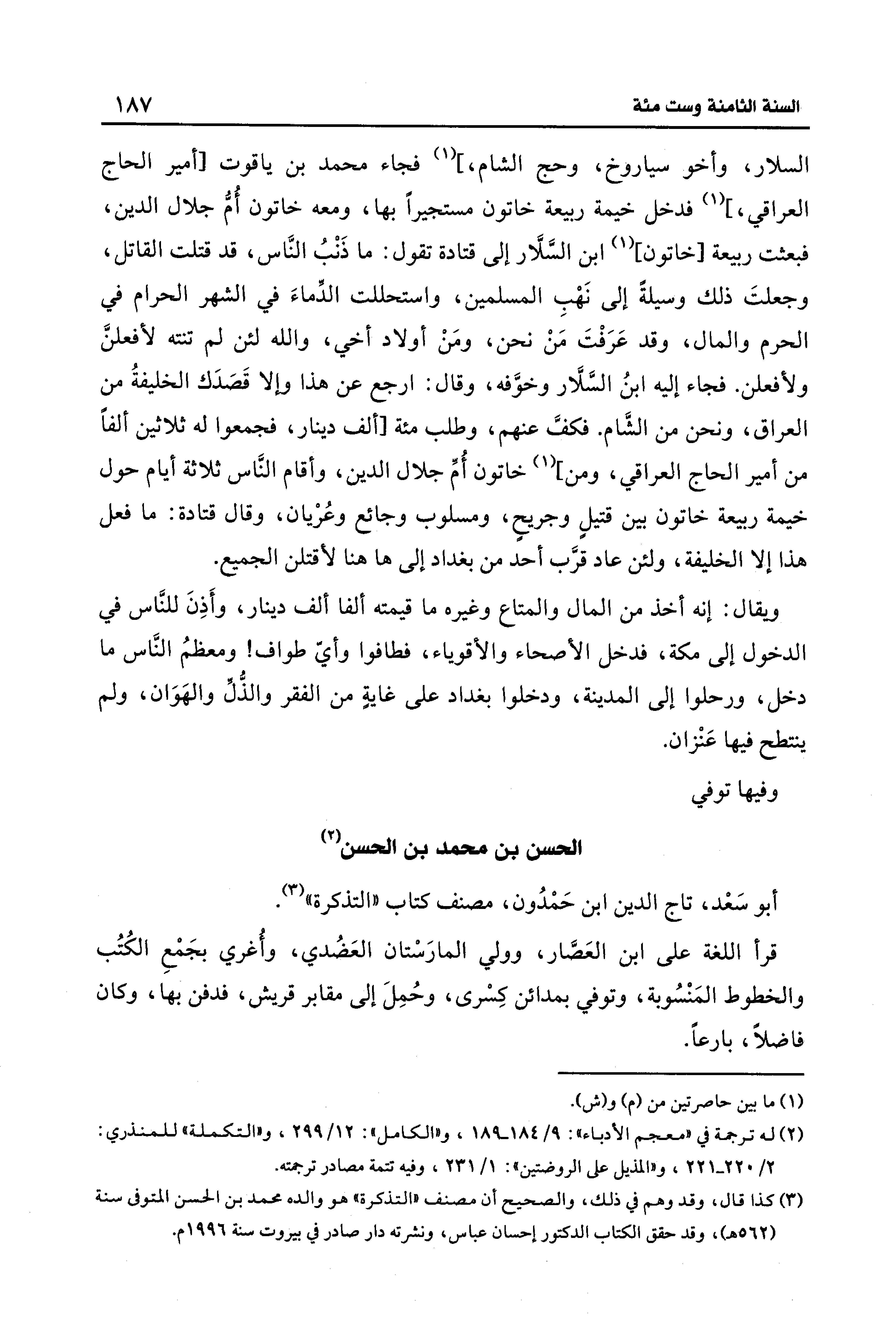 (¬3) كذا قال، وقد وهم في ذلك، والصحيح أن مصنف "التذكرة" هو والده محمد بن الحسن المتوفى سنة (562 هـ)، وقد حقق الكتاب الدكتور إحسان عباس، ونشرته دار صادر في بيروت سنة 1996 م.