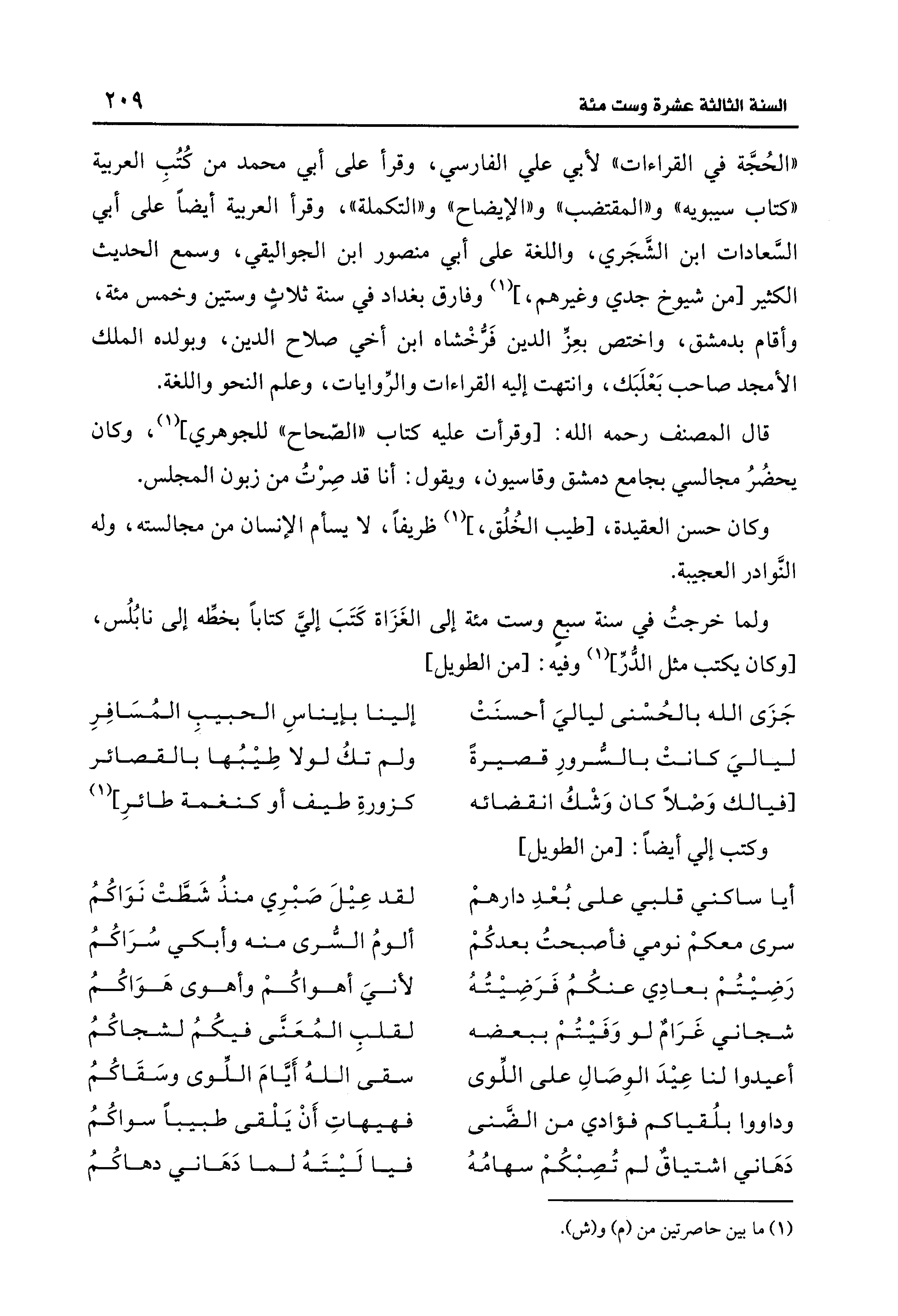 "الحُجَّة في القراءات" لأبي علي الفارسي، وقرأ على أبي محمَّد من كُتُبِ العربية "كتاب سيبويه" و"المقتضب" و"الإيضاح" و"التكملة"، وقرأ العربية أيضًا على أبي السَّعادات ابن الشَّجَري، واللغة على أبي منصور بن الجواليقي، وسمع الحديث الكثير [من شيوخ جدي وغيرهم,] (¬1) وفارق بغداد في سنة ثلاثٍ وستين وخمس مئة، وأقام بدمشق، واختص بعِزِّ الدين فَرُّخْشاه ابن أخي صلاح الدين، وبولده الملك الأمجد صاحب بَعْلَبَك، وانتهت إليه القراءات والرِّوايات، وعلم النحو واللغة.
