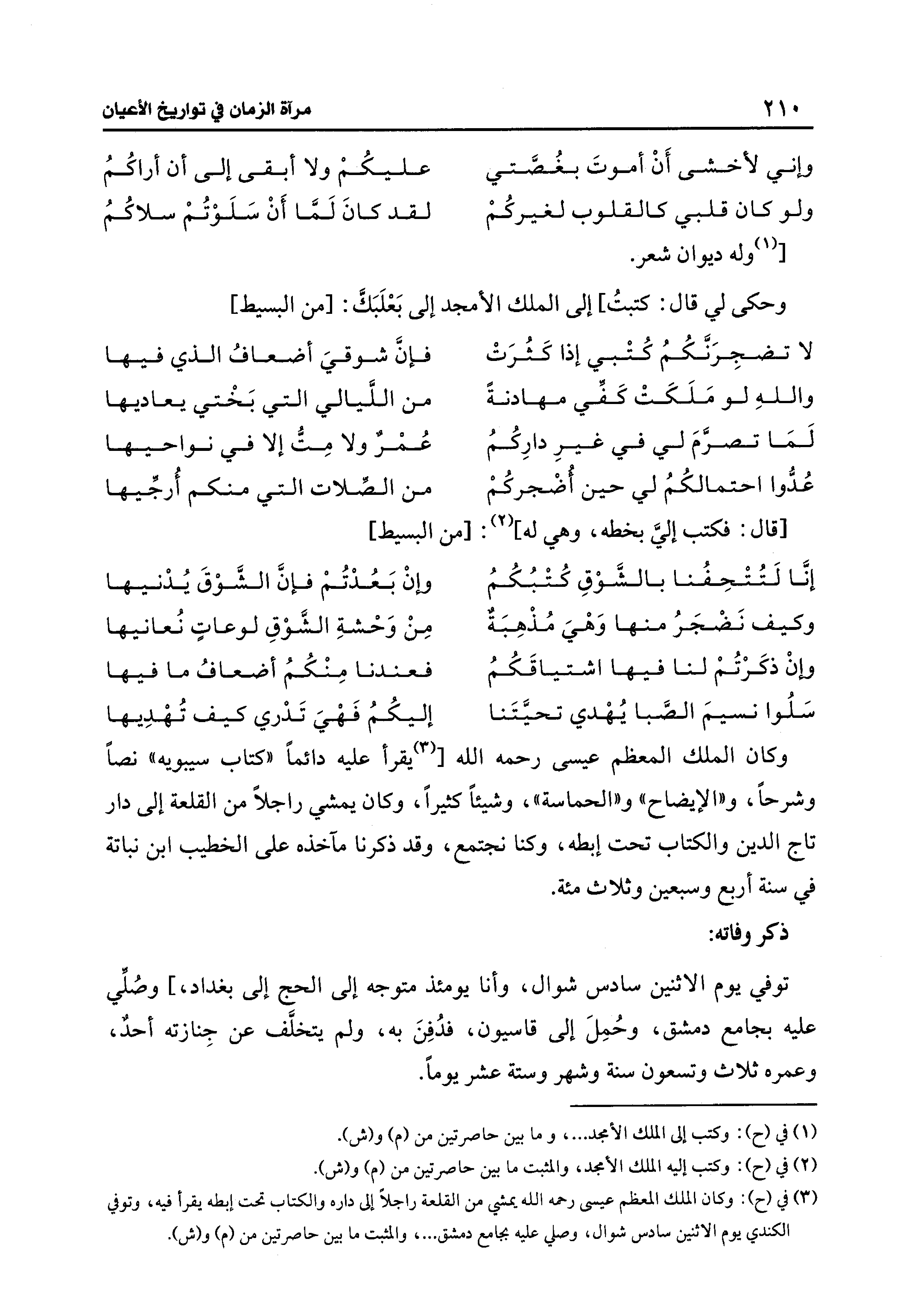 وكان الملك المعظم عيسى رحمه الله [(¬3) يقرأ عليه دائمًا "كتاب سيبويه" نصًّا وشرحًا، و"الإيضاح" و"الحماسة"، وشيئًا كثيرًا، وكان يمشي راجلًا من القلعة إلى دار تاج الدين والكتاب تحت إبطه، وكنا نجتمع، وقد ذكرنا مآخذه على الخطيب ابن نباتة في سنة أربع وسبعين وثلاث مئة.