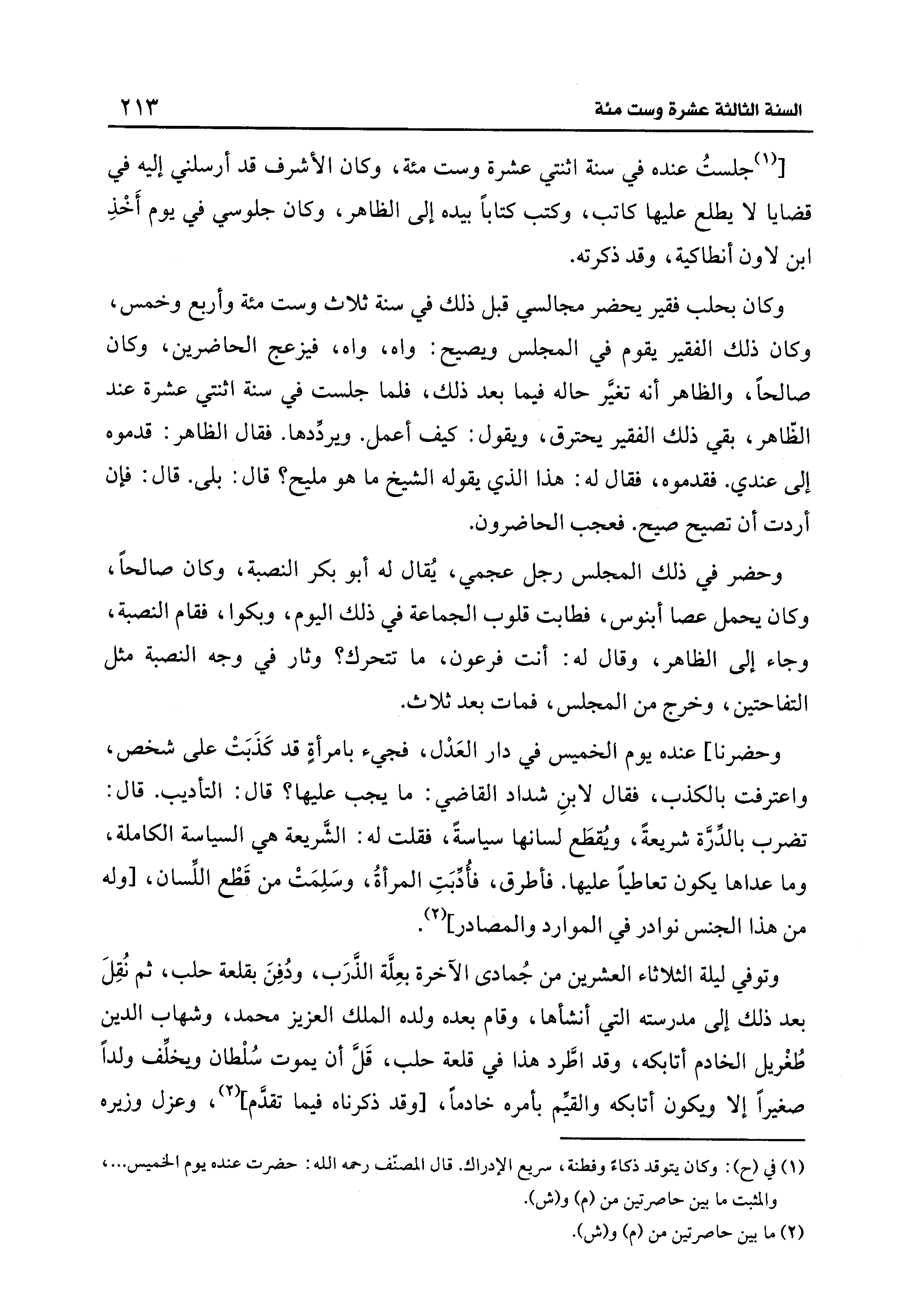 [(¬1) جلستُ عنده في سنة اثنتي عشرة وست مئة، وكان الأشرف قد أرسلني إليه في قضايا لا يطلع عليها كاتب، وكتب كتابًا بيده إلى الظاهر، وكان جلوسي في يوم أَخْذِ ابن لاون أنطاكية، وقد ذكرته.