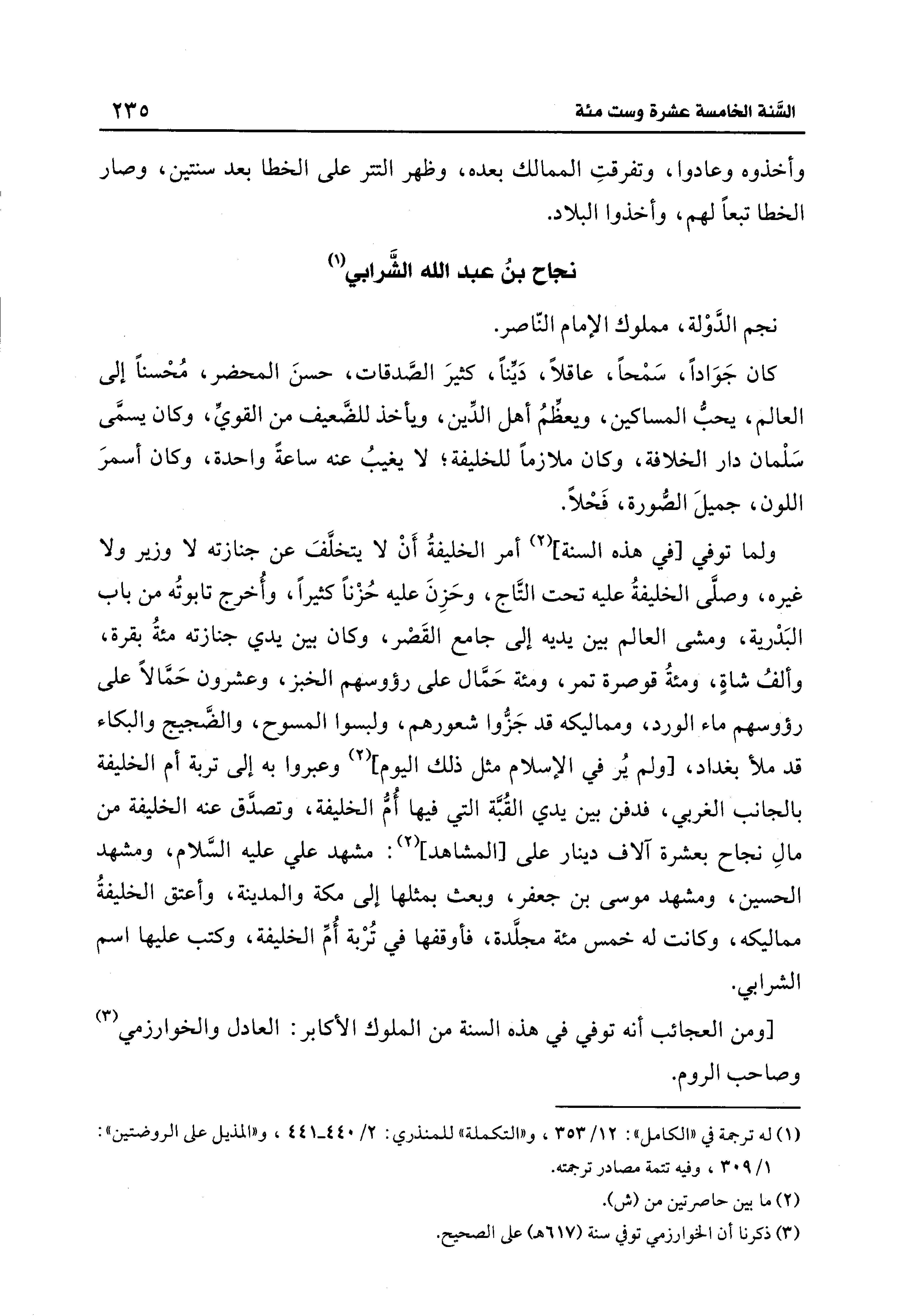 ولما توفي [في هذه السنة] (¬2) أمر الخليفةُ أَنْ لا يتخلَّفَ عن جنازته لا وزير ولا غيره، وصلَّى الخليفةُ عليه تحت التَّاج، وحَزِنَ عليه حُزْنًا كثيرًا، وأُخرج تابوتُه من باب البَدْرية، ومشى العالم بين يديه إلى جامع القَصْر، وكان بين يدي جنازته مئةُ بقرة، وألفُ شاةٍ، ومئةُ قوصرة تمر، ومئة حَمَّال على رؤوسهم الخبز، وعشرون حَمَّالًا على رؤوسهم ماء الورد، ومماليكه قد جَزُّوا شعورهم، ولبسوا المسوح، والضَّجيج والبكاء قد ملأ بغداد، [ولم يُر في الإِسلام مثل ذلك اليوم] (2) وعبروا به إلى تربة أم الخليفة بالجانب الغربي، فدفن بين يدي القُبَّة التي فيها أُمُّ الخليفة، وتصدَّق عنه الخليفة من مالِ نجاح بعشرة آلاف دينار على [المشاهد] (2): مشهد علي عليه السَّلام، ومشهد الحسين، ومشهد موسى بن جعفر، وبعث بمثلها إلى مكة والمدينة، وأعتق الخليفةُ مماليكه، وكانت له خمس مئة مجلَّدة، فأوقفها في تُرْبة أُمِّ الخليفة، وكتب عليها اسم الشرابي.
