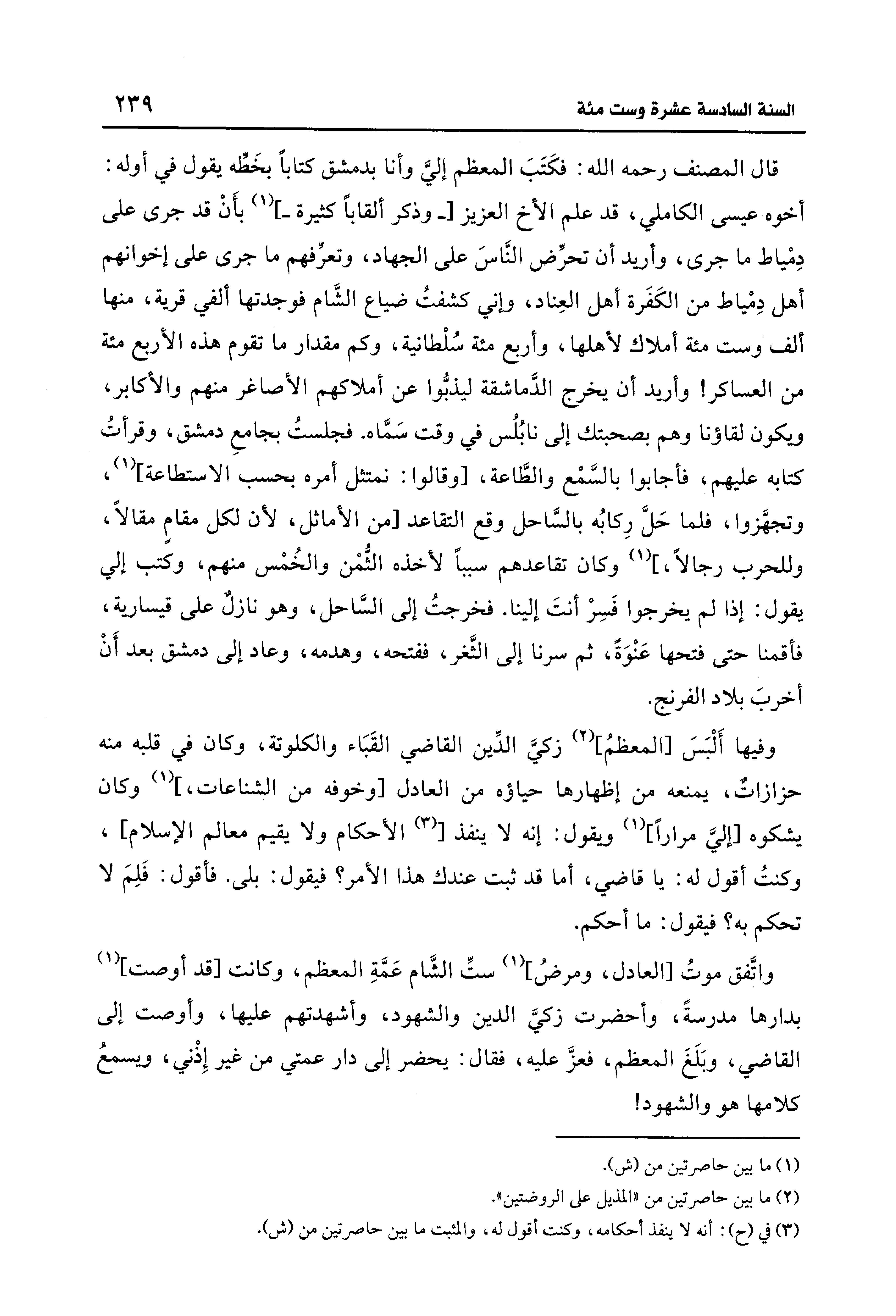 قال المصنف رحمه الله: فكَتَبَ المعظم إليَّ وأنا بدمشق كتابًا بخَطِّه يقول في أوله: أخوه عيسى الكاملي، قد علم الأخ العزيز [-وذكر ألقابًا كثيرة-] (¬1) بأَنْ قد جرى على دِمْياط ما جرى، وأريد أن تحرِّض النَّاسَ على الجهاد، وتعرِّفهم ما جرى على إخوانهم أهل دِمْياط من الكَفَرة أهل العِناد، وإني كشفتُ ضياع الشَّام فوجدتها ألفي قرية، منهما ألف وست مئة أملاك لأهلها، وأربع مئة سُلْطانية، وكم مقدار ما تقوم هذه الأربع مئة من العساكر! وأريد أن يخرج الدَّماشقة ليذبُّوا عن أملاكهم الأصاغر منهم والأكابر، ويكون لقاؤنا وهم بصحبتك إلى نابُلُس في وقت سَمَّاه. فجلستُ بجامعِ دمشق، وقرأتُ كتابه عليهم، فأجابوا بالسَّمْع والطَّاعة، [وقالوا: نمتثل أمره بحسب الاستطاعة] (1)، وتجهَّزوا، فلما حَلَّ رِكابُه بالسَّاحل وقع التقاعد [من الأماثل, لأن لكل مقامٍ مقالًا، وللحرب رجالًا,] (1) وكان تقاعدهم سببًا لأخذه الثُّمْن والخُمْس منهم، وكتب إلى يقول: إذا لم يخرجوا فَسِرْ أنتَ إلينا. فخرجتُ إلى السَّاحل، وهو نازلٌ على قيسارية، فأقمنا حتى فتحها عَنْوَةً، ثم سرنا إلى الثَّغر، ففتحه، وهدمه، وعاد إلى دمشق بعد أَنْ أخربَ بلاد الفرنج.