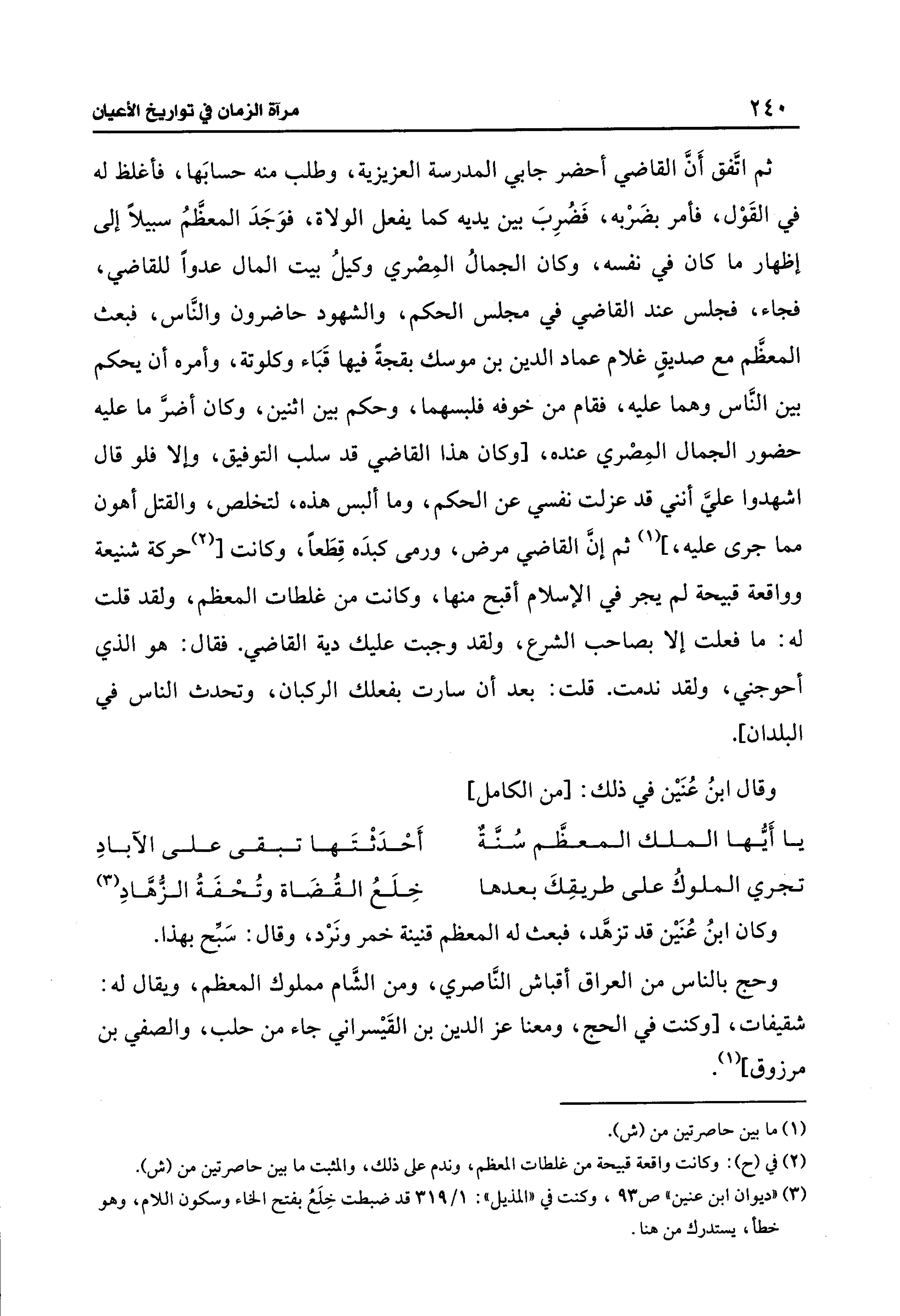 ثم اتَّفق أَنَّ القاضي أحضر جابي المدرسة العزيزية، وطلب منه حسابَها، فأغلظ له في القَوْل، فأمر بضَرْبه، فَضُرِبَ بين يديه كما يفعل الولاة، فوَجَدَ المعظَّمُ سبيلًا إلى إظهار ما كان في نفسه، وكان الجمالُ المِصْري وكيلُ بيت المال عدوًا للقاضي، فجاء، فجلس عند القاضي في مجلس الحكم، والشهود حاضرون والنَّاس، فبعث المعظَّم مع صديقٍ غلام عماد الدين بن موسك بقجةً فيها قَبَاء وكلوتة، وأمره أن يحكم بين النَّاس وهما عليه، فقام من خوفه فلبسهما، وحكم بين اثنين، وكان أضرَّ ما عليه حضور الجمال المِصْري عنده، [وكان هذا القاضي قد سلب التوفيق، وإلا فلو قال اشهدوا علي أنني قد عزلت نفسي عن الحكم، وما ألبس هذه، لتخلص، والقتل أهون مما جرى عليه,] (¬1) ثم إنَّ القاضي مرض، ورمى كبدَه قِطَعًا، وكانت [(¬2) حركة شنيعة وواقعة قبيحة لم يجر في الإِسلام أقبح منها، وكانت من غلطات المعظم، ولقد قلت له: ما فعلت إلَّا بصاحب الشرع، ولقد وجبت عليك دية القاضي. فقال: هو الذي أحوجني، ولقد ندمت. قلت: بعد أن سارت بفعلك الركبان، وتحدث النَّاس في البلدان].
