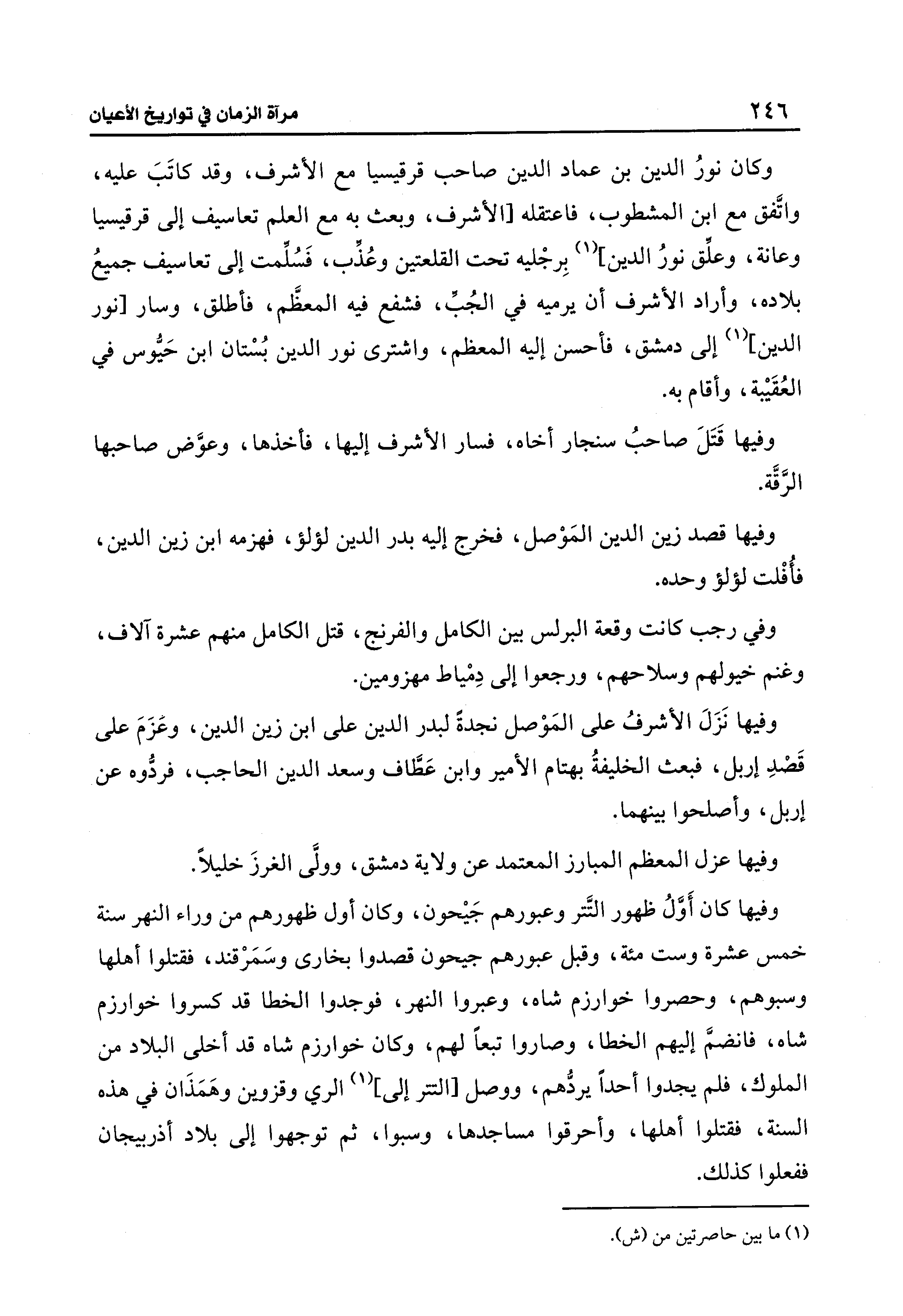 وكان نورُ الدين بن عماد الدين صاحب قرقيسيا مع الأشرف، وقد كاتَبَ عليه، واتَّفق مع ابن المشطوب، فاعتقله [الأشرف، وبعث به مع العلم تعاسيف إلى قرقيسيا وعانة، وعلِّق نورُ الدين] (¬1) بِرجْليه تحت القلعتين وعُذب، فَسُلِّمت إلى تعاسيف جميعُ بلاده، وأراد الأشرف أن يرميه في الجُبِّ، فشفع فيه المعظَّم، فأطلق، وسار [نور الدين] (1) إلى دمشق، فأحسن إليه المعظم، واشترى نور الدين بُسْتان ابن حَيُّوس في العُقَيبة، وأقام به.