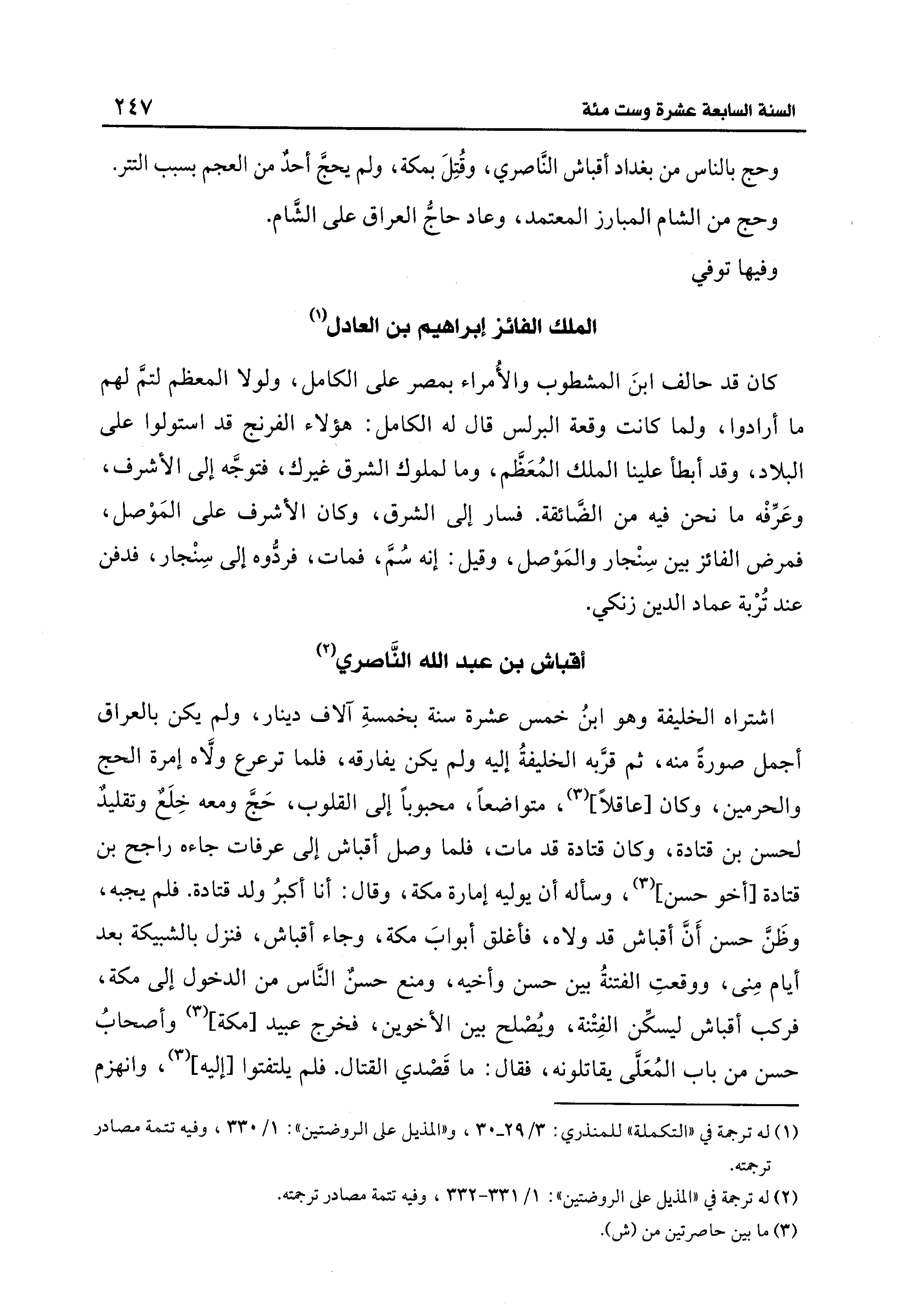 وحج بالنَّاس من بغداد أقباش النَّاصري، وقُتِلَ بمكة، ولم يحجَّ أحدٌ من العجم بسبب التتر.